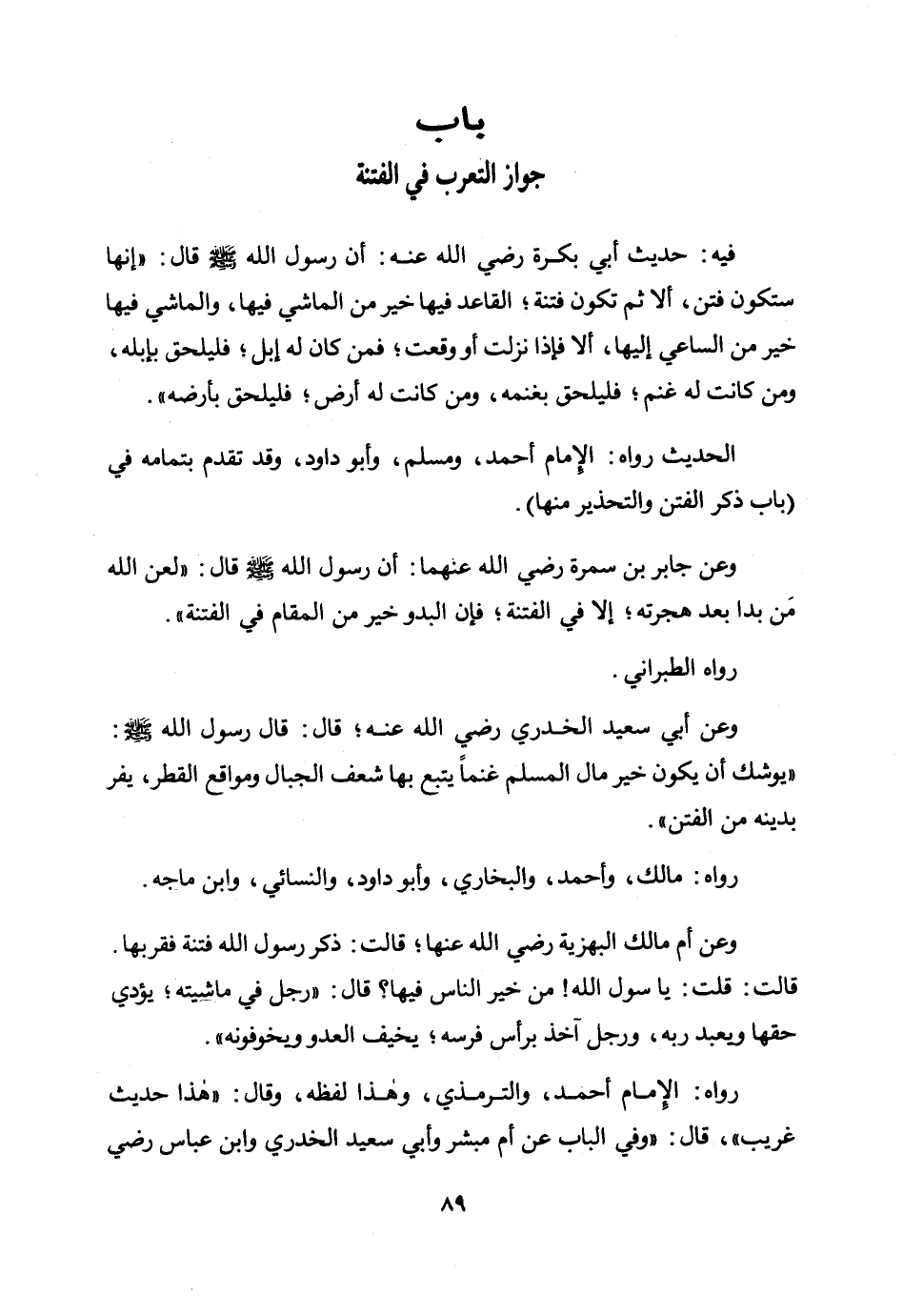 وعن جابر بن سمرة رضي الله عنهما: أن رسول الله صلى الله عليه وسلم قال: «لعن الله من بدا بعد هجرته؛ إلا في الفتنة؛ فإن البدو خير من المقام في الفتنة» .