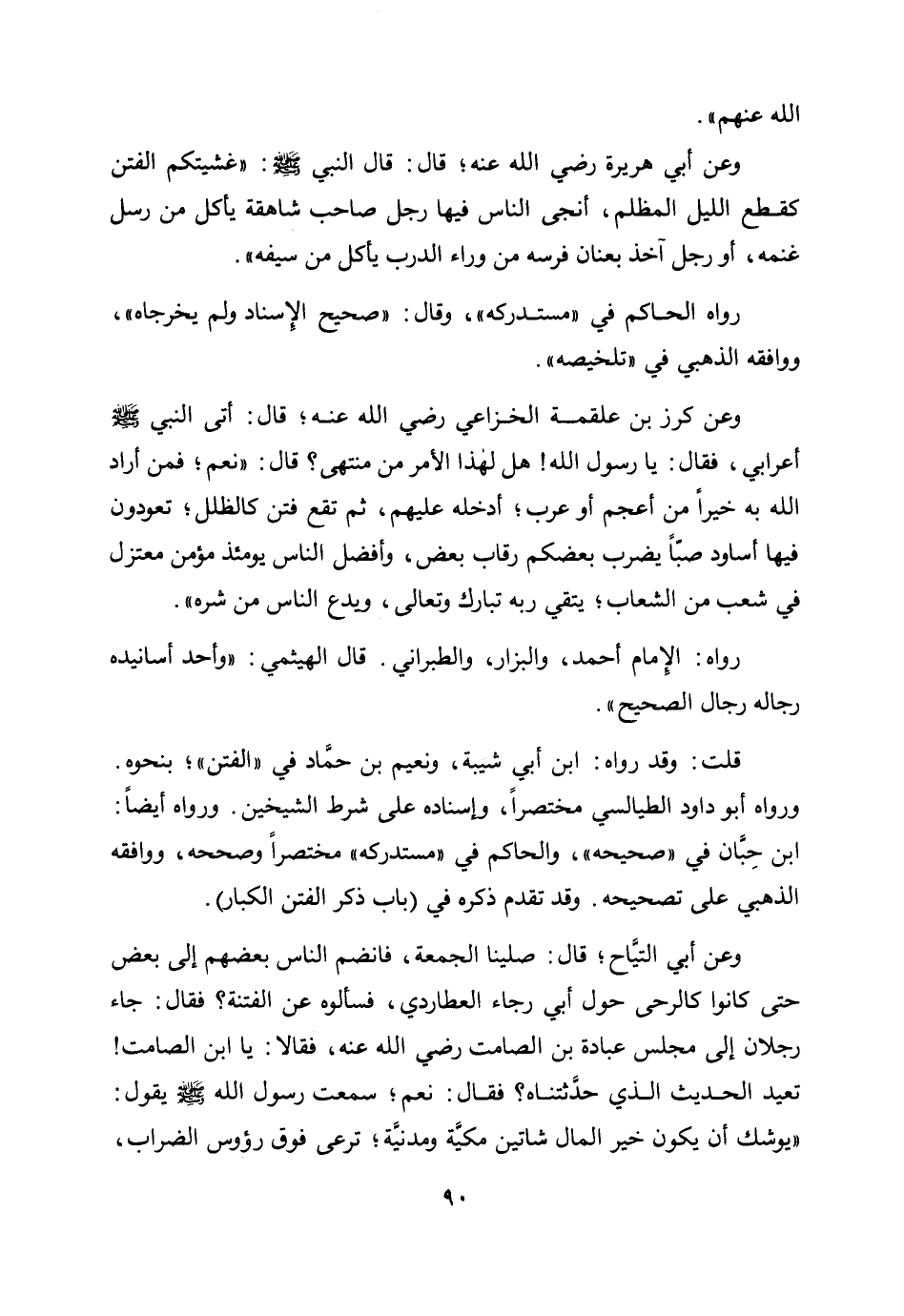 وعن كرز بن علقمة الخزاعي رضي الله عنه؛ قال: «أتى النبي صلى الله عليه وسلم أعرابي، فقال: يا رسول الله! هل لهذا الأمر من منتهى؟ قال: نعم؛ فمن أراد الله به خيرًا من أعجم أو عرب؛ أدخله عليهم، ثم تقع فتن كالظلل؛ تعودون فيها أساود صبًا يضرب بعضكم رقاب بعض، وأفضل الناس يومئذ مؤمن معتزل في شعب من الشعاب؛ يتقي ربه تبارك وتعالى، ويدع الناس من شره» .