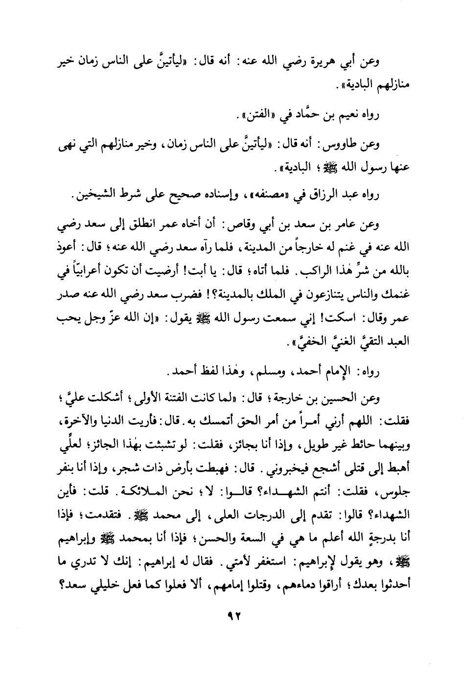 وعن عامر بن سعد بن أبي وقاص: أن أخاه عمر انطلق إلى سعد رضي الله عنه في غنم له خارجا من المدينة، فلما رآه سعد رضي الله عنه؛ قال: أعوذ بالله من شر هذا الراكب. فلما أتاه قال: يا أبت أرضيت أن تكون أعرابيا في غنمك والناس يتنازعون في الملك بالمدينة؟ ! فضرب سعد رضي الله عنه صدر عمر وقال: اسكت! إني سمعت رسول الله صلى الله عليه وسلم يقول: «إن الله عز وجل يحب العبد التقي الغني الخفي» .