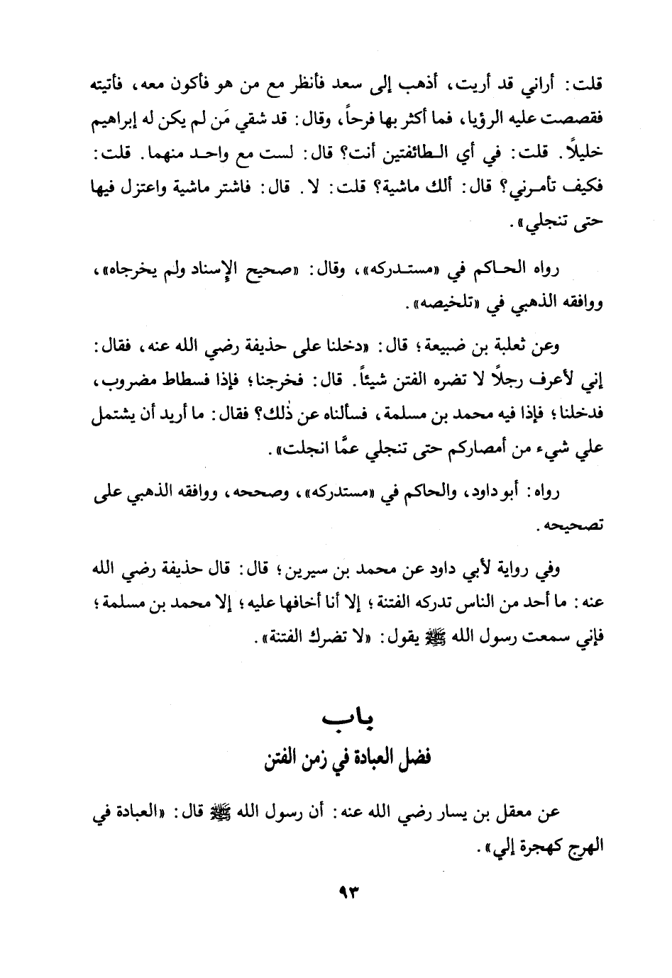 قلت: أراني قد أريت، أذهب إلى سعد فأنظر مع من هو فأكون معه، فأتيته فقصصت عليه الرؤيا، فما أكثر بها فرحا، وقال: قد شقي من لم يكن له إبراهيم خليلا. قلت: في أي الطائفتين أنت؟ قال: لست مع واحد منهما. قلت: فكيف تأمرني؟ قال: ألك ماشية؟ قلت: لا. قال: فاشتر ماشية واعتزل فيها حتى تنجلي".