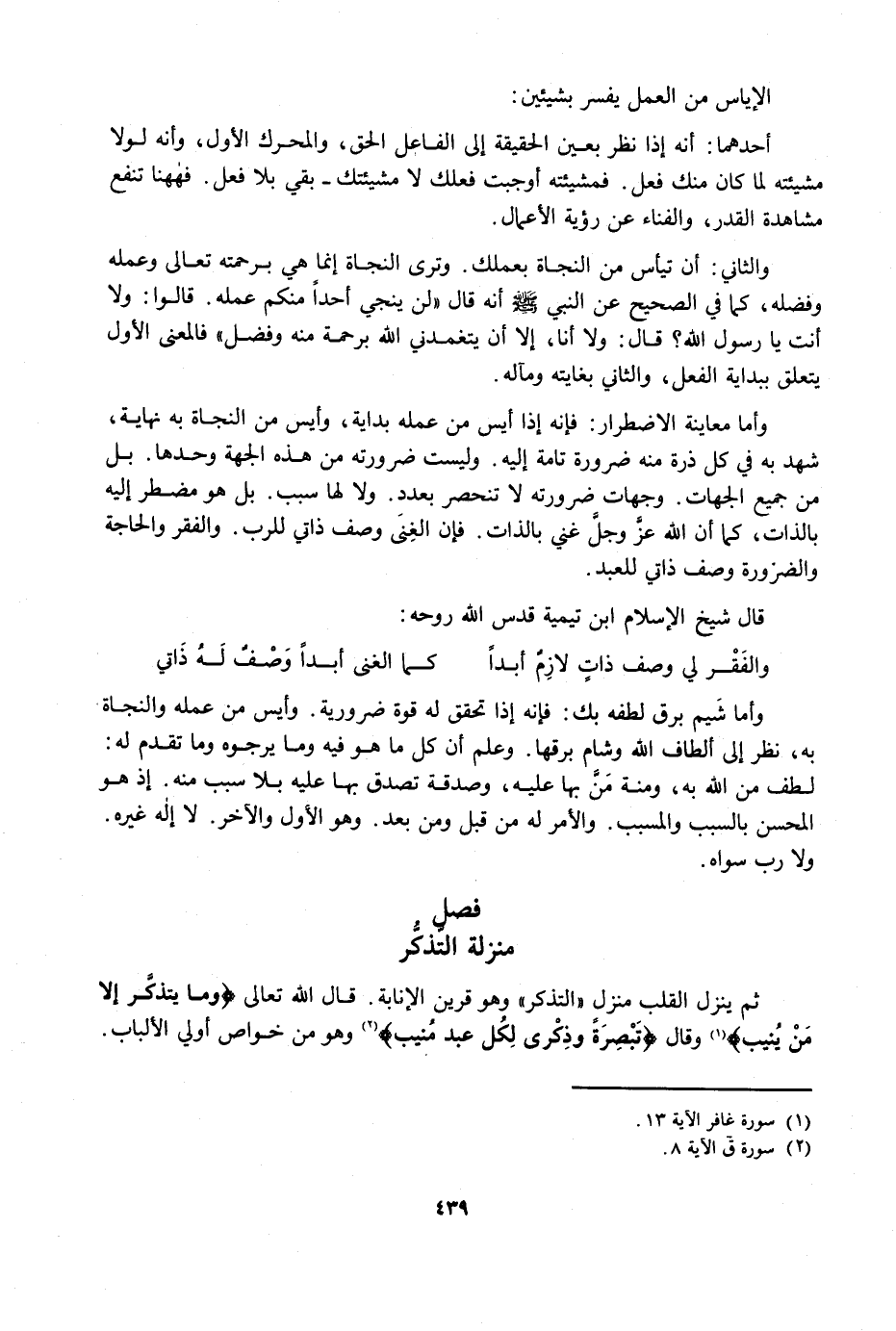 وَالثَّانِي: أَنْ تَيْأَسَ مِنَ النَّجَاةِ بِعَمَلِكَ، وَتَرَى النَّجَاةَ إِنَّمَا هِيَ بِرَحْمَتِهِ تَعَالَى وَعَمَلِهِ وَفَضْلِهِ، كَمَا فِي الصَّحِيحِ عَنِ النَّبِيِّ صَلَّى اللَّهُ عَلَيْهِ وَسَلَّمَ أَنَّهُ قَالَ «لَنْ يُنْجِيَ أَحَدًا مِنْكُمْ عَمَلُهُ، قَالُوا: وَلَا أَنْتَ يَا رَسُولَ اللَّهِ؟ قَالَ: وَلَا أَنَا، إِلَّا أَنْ يَتَغَمَّدَنِي اللَّهُ بِرَحْمَةٍ مِنْهُ وَفَضْلٍ» فَالْمَعْنَى الْأَوَّلُ يَتَعَلَّقُ بِبِدَايَةِ الْفِعْلِ، وَالثَّانِي بِغَايَتِهِ وَمَآلِهِ.