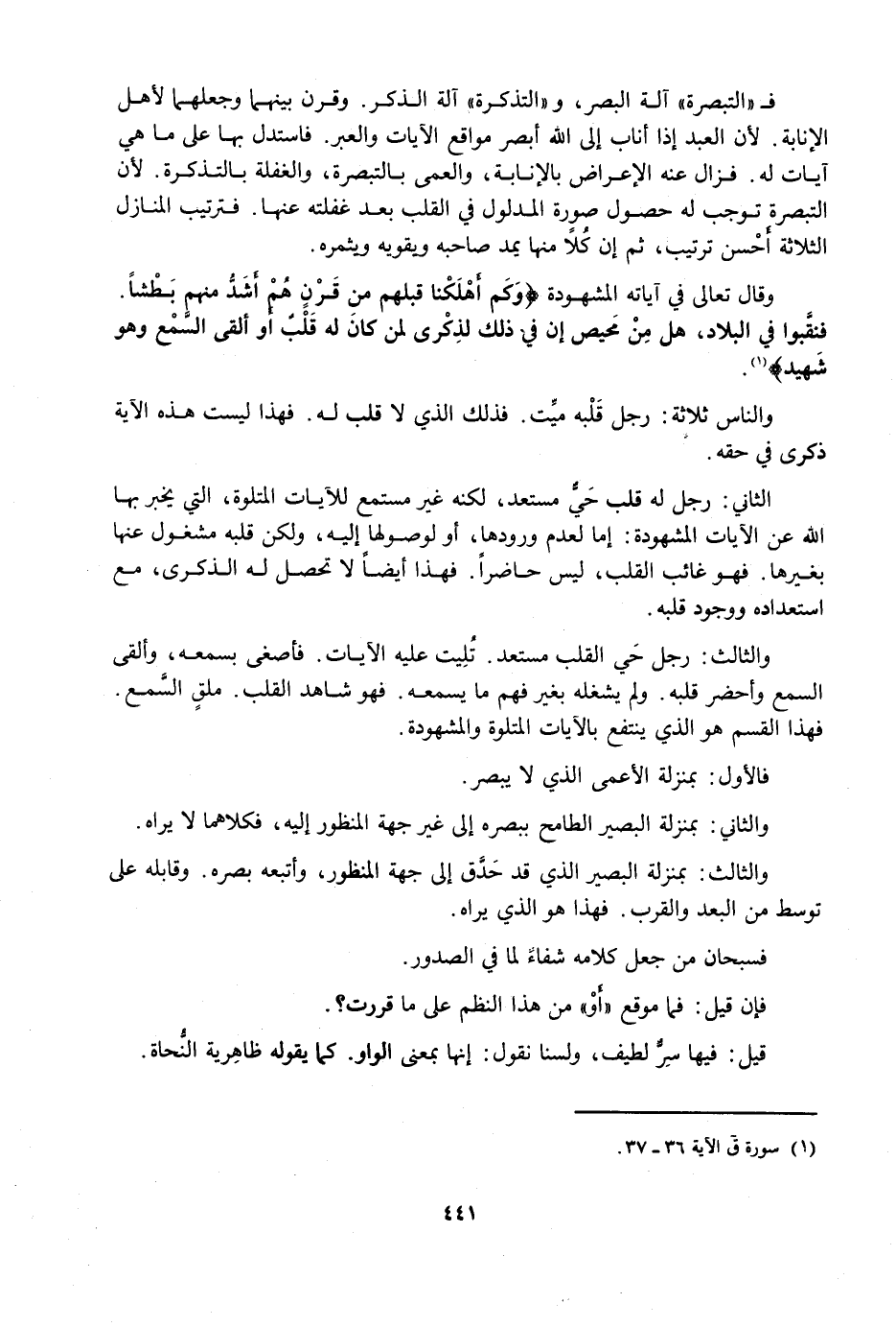 الثَّالِثُ: رَجُلٌ حَيُّ الْقَلْبِ مُسْتَعِدٌّ، تُلِيَتْ عَلَيْهِ الْآيَاتُ، فَأَصْغَى بِسَمْعِهِ، وَأَلْقَى السَّمْعَ وَأَحْضَرَ قَلْبَهُ، وَلَمْ يَشْغَلْهُ بِغَيْرِ فَهْمِ مَا يَسْمَعُهُ، فَهُوَ شَاهِدُ الْقَلْبِ، مُلْقٍ السَّمْعَ، فَهَذَا الْقِسْمُ هُوَ الَّذِي يَنْتَفِعُ بِالْآيَاتِ الْمَتْلُوَّةِ وَالْمَشْهُودَةِ.