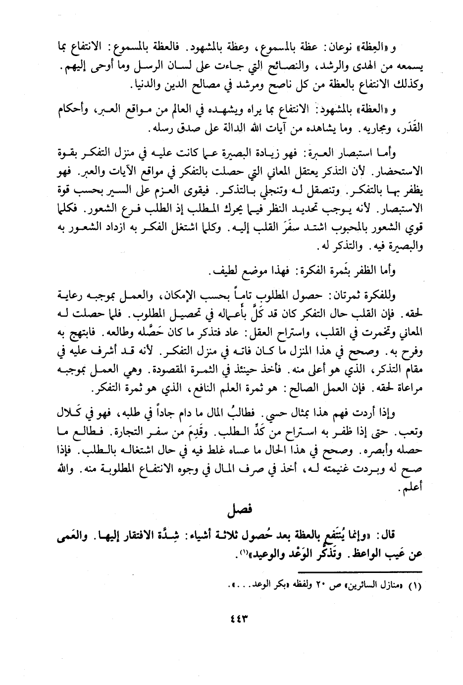 فَصْلٌ قَالَ: وَإِنَّمَا يَنْتَفِعُ بِالْعِظَةِ بَعْدَ حُصُولِ ثَلَاثَةِ أَشْيَاءَ: شِدَّةِ الِافْتِقَارِ إِلَيْهَا، وَالْعَمَى عَنْ عَيْبِ الْوَاعِظِ، وَتَذَكُّرِ الْوَعْدِ وَالْوَعِيدِ.