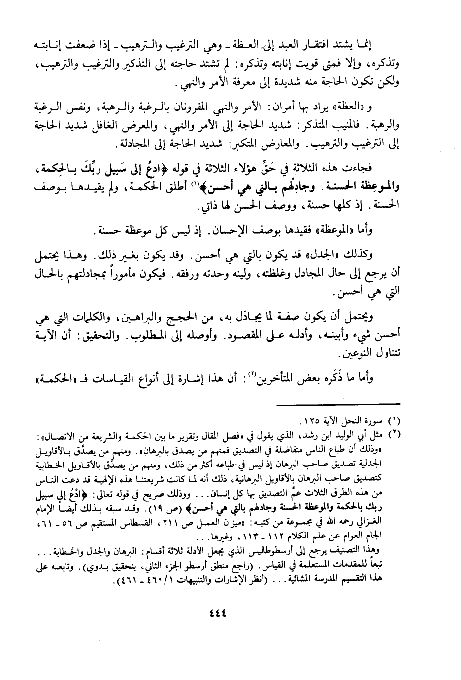فَجَاءَتْ هَذِهِ الثَّلَاثَةُ فِي حَقِّ هَؤُلَاءِ الثَّلَاثَةِ فِي قَوْلِهِ: {ادْعُ إِلَى سَبِيلِ رَبِّكَ بِالْحِكْمَةِ وَالْمَوْعِظَةِ الْحَسَنَةِ وَجَادِلْهُمْ بِالَّتِي هِيَ أَحْسَنُ} [النحل: 125] أَطْلَقَ الْحِكْمَةَ وَلَمْ يُقَيِّدْهَا بِوَصْفِ الْحَسَنَةِ، إِذْ كُلُّهَا حَسَنَةٌ، وَوَصْفُ الْحُسْنِ لَهَا ذَاتِيٌّ.