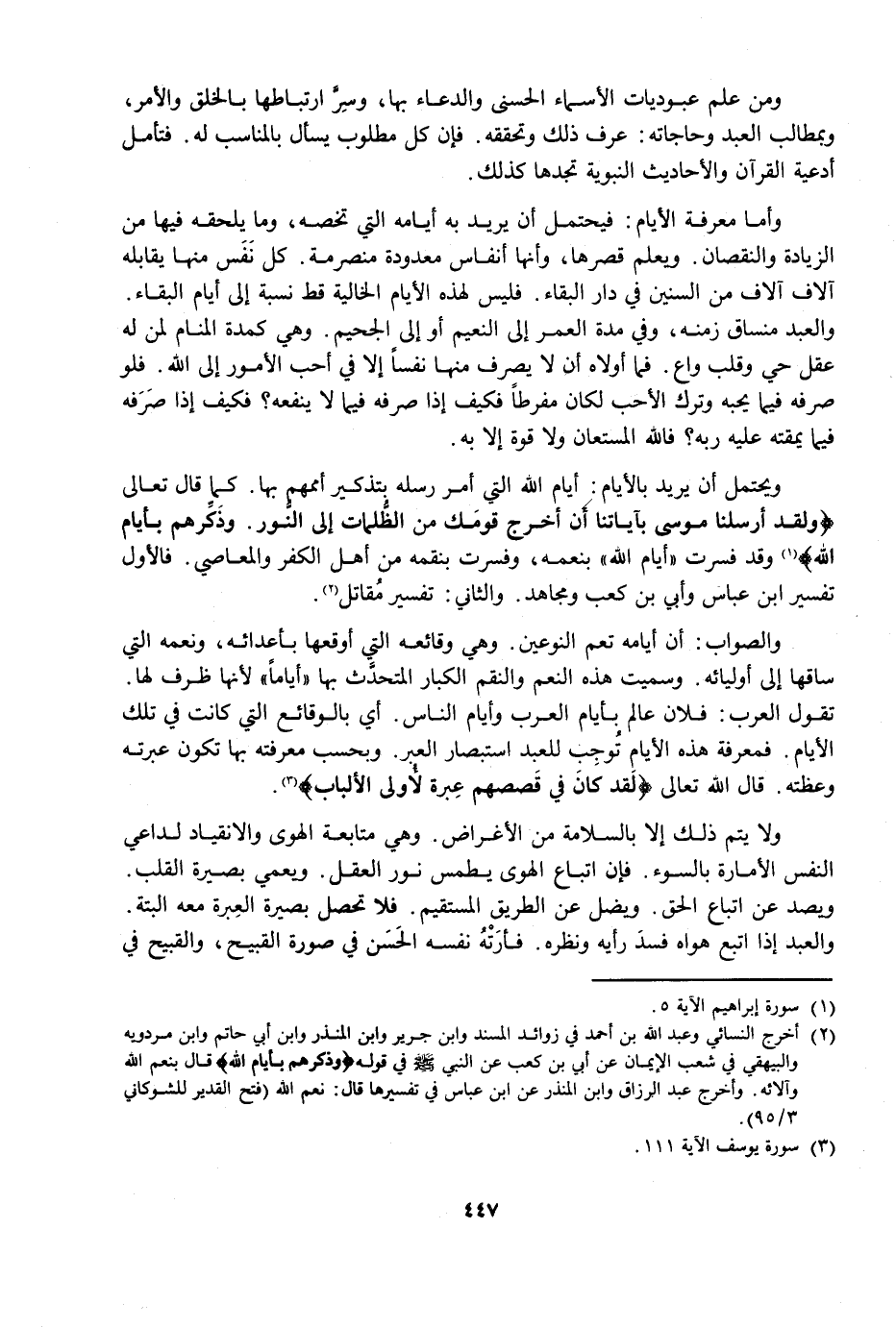وَالصَّوَابُ أَنَّ أَيَّامَهُ تَعُمُّ النَّوْعَيْنِ، وَهِيَ وَقَائِعُهُ الَّتِي أَوْقَعَهَا بِأَعْدَائِهِ، وَنِعَمُهُ الَّتِي سَاقَهَا إِلَى أَوْلِيَائِهِ، وَسُمِّيَتْ هَذِهِ النِّعَمُ وَالنِّقَمُ الْكِبَارُ الْمُتَحَدَّثُ بِهَا أَيَّامًا لِأَنَّهَا ظَرْفٌ لَهَا، تَقُولُ الْعَرَبُ: فُلَانٌ عَالِمٌ بِأَيَّامِ الْعَرَبِ وَأَيَّامِ النَّاسِ، أَيْ بِالْوَقَائِعِ الَّتِي كَانَتْ فِي تِلْكَ الْأَيَّامِ، فَمَعْرِفَةُ هَذِهِ الْأَيَّامِ تُوجِبُ لِلْعَبْدِ اسْتِبْصَارَ الْعِبَرِ، وَبِحَسَبِ مَعْرِفَتِهِ بِهَا تَكُونُ عِبْرَتُهُ وَعَظَمَتُهُ، قَالَ اللَّهُ تَعَالَى {لَقَدْ كَانَ فِي قَصَصِهِمْ عِبْرَةٌ لِأُولِي الْأَلْبَابِ} [يوسف: 111] .