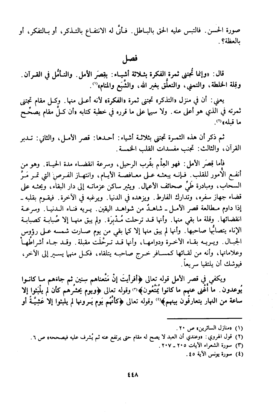 قَالَ: وَإِنَّمَا تُجْتَنَى ثَمَرَةُ الْفِكْرَةِ بِثَلَاثَةِ أَشْيَاءَ: بِقِصَرِ الْأَمَلِ، وَالتَّأَمُّلِ فِي الْقُرْآنِ، وَقِلَّةِ الْخُلْطَةِ وَالتَّمَنِّي وَالتَّعَلُّقِ بِغَيْرِ اللَّهِ وَالشِّبَعِ وَالْمَنَامِ.