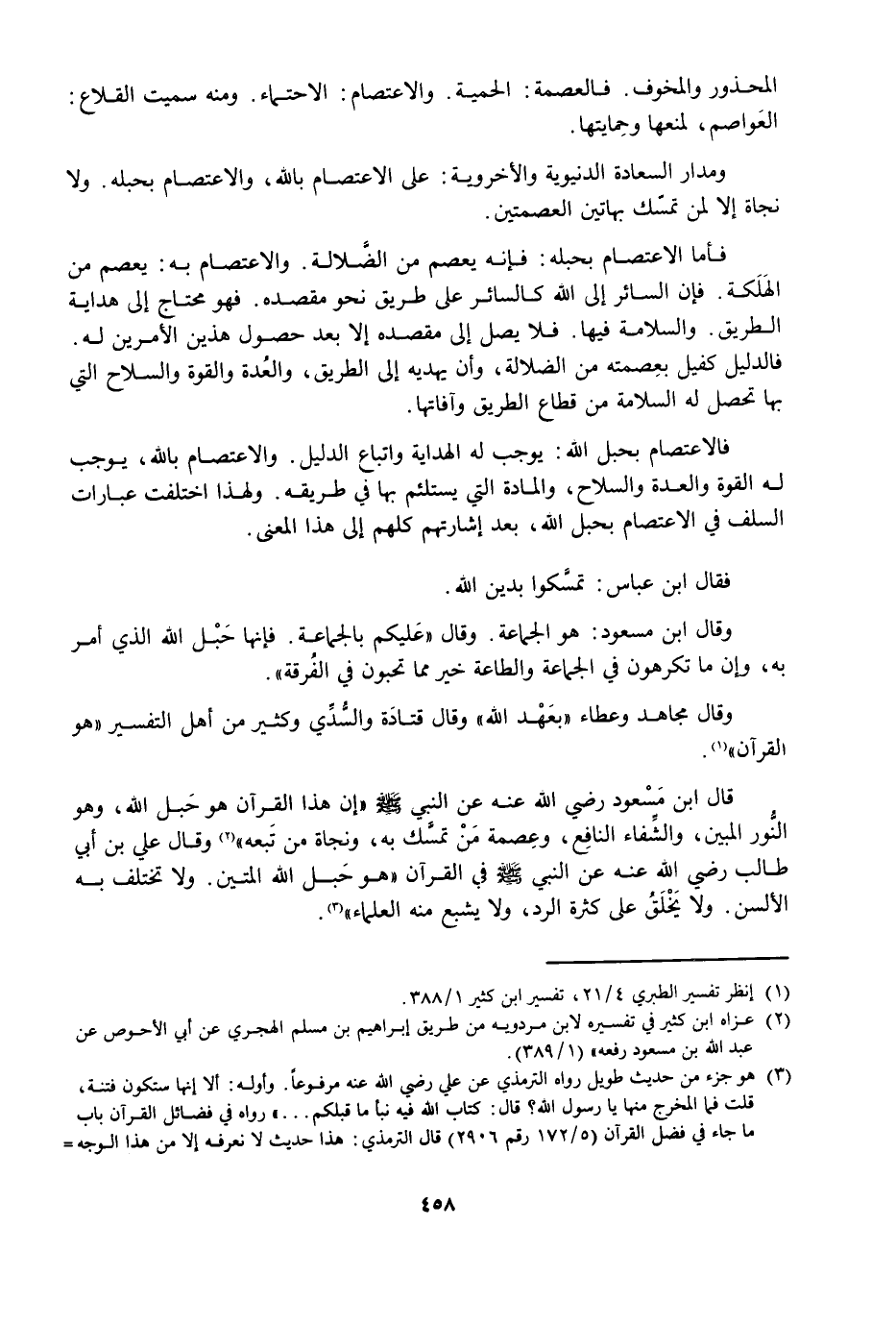 فَالِاعْتِصَامُ بِحَبْلِ اللَّهِ يُوجِبُ لَهُ الْهِدَايَةَ وَاتِّبَاعَ الدَّلِيلِ، وَالِاعْتِصَامُ بِاللَّهِ، يُوجِبُ لَهُ الْقُوَّةَ وَالْعُدَّةَ وَالسِّلَاحَ، وَالْمَادَّةَ الَّتِي يَسْتَلْئِمُ بِهَا فِي طَرِيقِهِ، وَلِهَذَا اخْتَلَفَتْ عِبَارَاتُ السَّلَفِ فِي الِاعْتِصَامِ بِحَبْلِ اللَّهِ، بَعْدَ إِشَارَتِهِمْ كُلِّهِمْ إِلَى هَذَا الْمَعْنَى.