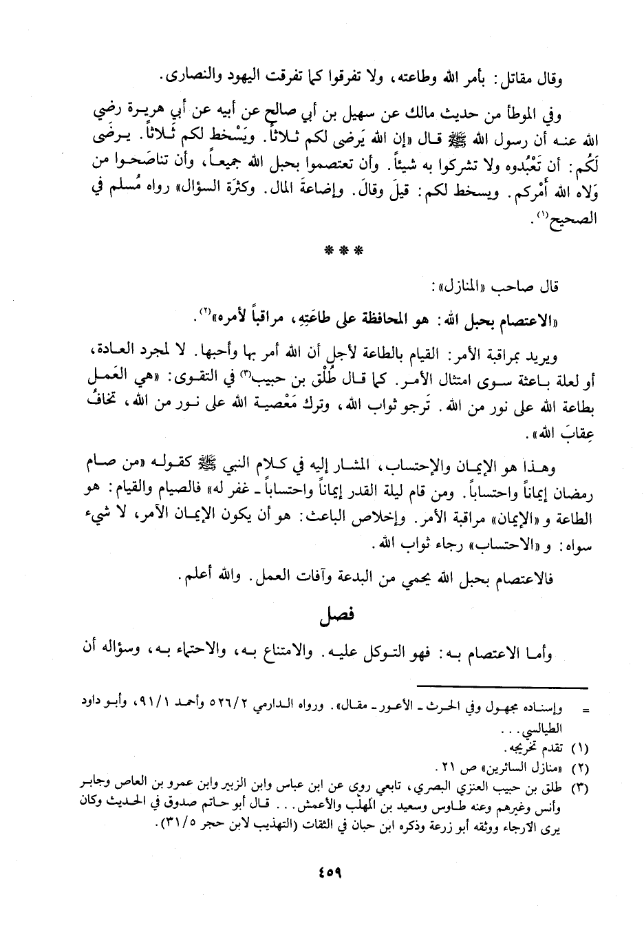 قَالَ صَاحِبُ الْمَنَازِلِ: الِاعْتِصَامُ بِحَبْلِ اللَّهِ هُوَ الْمُحَافَظَةُ عَلَى طَاعَتِهِ، مُرَاقِبًا لِأَمْرِهِ.