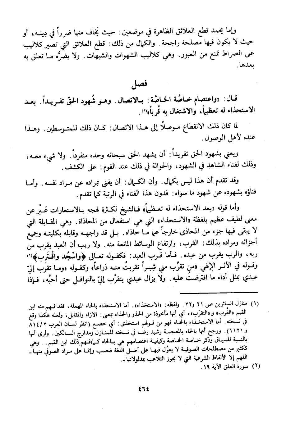 وَإِنَّمَا يُحْمَدُ قَطْعُ الْعَلَائِقِ الظَّاهِرَةِ فِي مَوْضِعَيْنِ: حَيْثُ يَخَافُ مِنْهَا ضَرَرًا فِي دِينِهِ أَوْ حَيْثُ لَا يَكُونُ فِيهَا مَصْلَحَةً رَاجِحَةً، وَالْكَمَالُ مِنْ ذَلِكَ قِطَعُ الْعَلَائِقِ الَّتِي تَصِيرُ كَلَالِيبَ عَلَى الصِّرَاطِ تَمْنَعُهُ مِنَ الْعُبُورِ، وَهِيَ كَلَالِيبُ الشَّهَوَاتِ وَالشُّبُهَاتِ، وَلَا يَضُرُّهُ مَا تَعَلَّقَ بِهِ بَعْدَهَا.