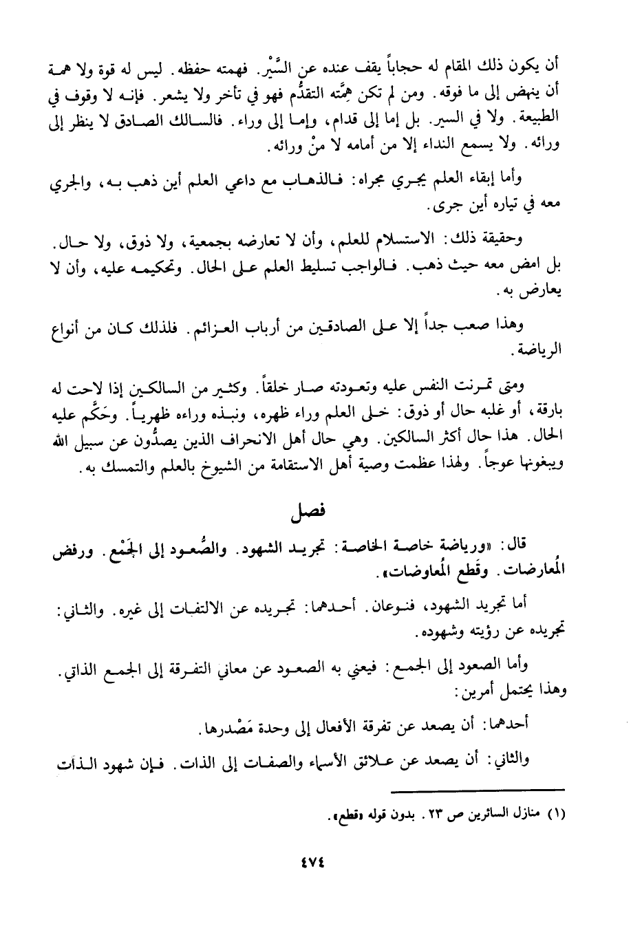 قَالَ: وَرِيَاضَةُ خَاصَّةِ الْخَاصَّةِ: تَجْرِيدُ الشُّهُودِ، وَالصُّعُودُ إِلَى الْجَمْعِ، وَرَفْضُ الْمُعَارَضَاتِ، وَقَطْعُ الْمُعَاوَضَاتِ.