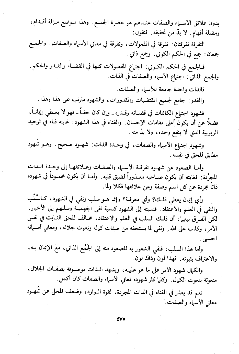 وَأَمَّا الصُّعُودُ عَنْ شُهُودِ تَفْرِقَةِ الْأَسْمَاءِ وَالصِّفَاتِ وَعَلَائِقِهَا إِلَى وَحْدَةِ الذَّاتِ الْمُجَرَّدَةِ فَغَايَتُهُ أَنْ يَكُونَ صَاحِبُهُ مَعْذُورًا لِضِيقِ قَلْبِهِ، وَأَمَّا أَنْ يَكُونَ مَحْمُودًا فِي شُهُودِهِ ذَاتًا مُجَرَّدَةً عَنْ كُلِّ اسْمٍ وَصِفَةٍ وَعَنْ عَلَائِقِهَا فَكَلَّا وَلَمَّا.
