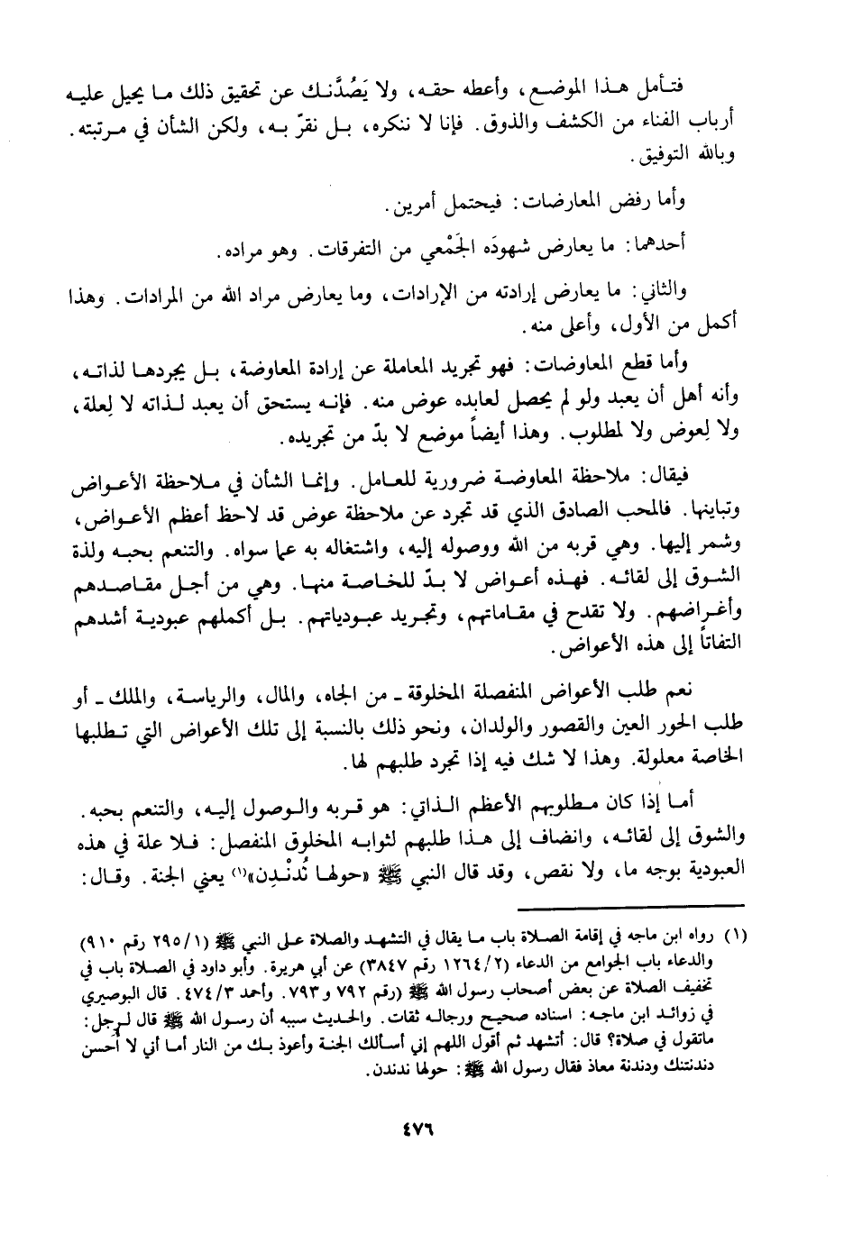 أَمَّا إِذَا كَانَ مَطْلُوبُهُمُ الْأَعْظَمُ الذَّاتِيُّ هُوَ قُرْبَهُ وَالْوُصُولَ إِلَيْهِ، وَالتَّنَعُّمَ بِحُبِّهِ، وَالشَّوْقَ إِلَى لِقَائِهِ، وَانْضَافَ إِلَى هَذَا طَلَبُهُمْ لِثَوَابِهِ الْمَخْلُوقِ الْمُنْفَصِلِ فَلَا عِلَّةَ فِي هَذِهِ الْعُبُودِيَّةِ بِوَجْهٍ مَا، وَلَا نَقْصَ، وَقَدْ قَالَ النَّبِيُّ صَلَّى اللَّهُ عَلَيْهِ وَسَلَّمَ حَوْلَهَا نُدَنْدِنُ يَعْنِي الْجَنَّةَ، وَقَالَ