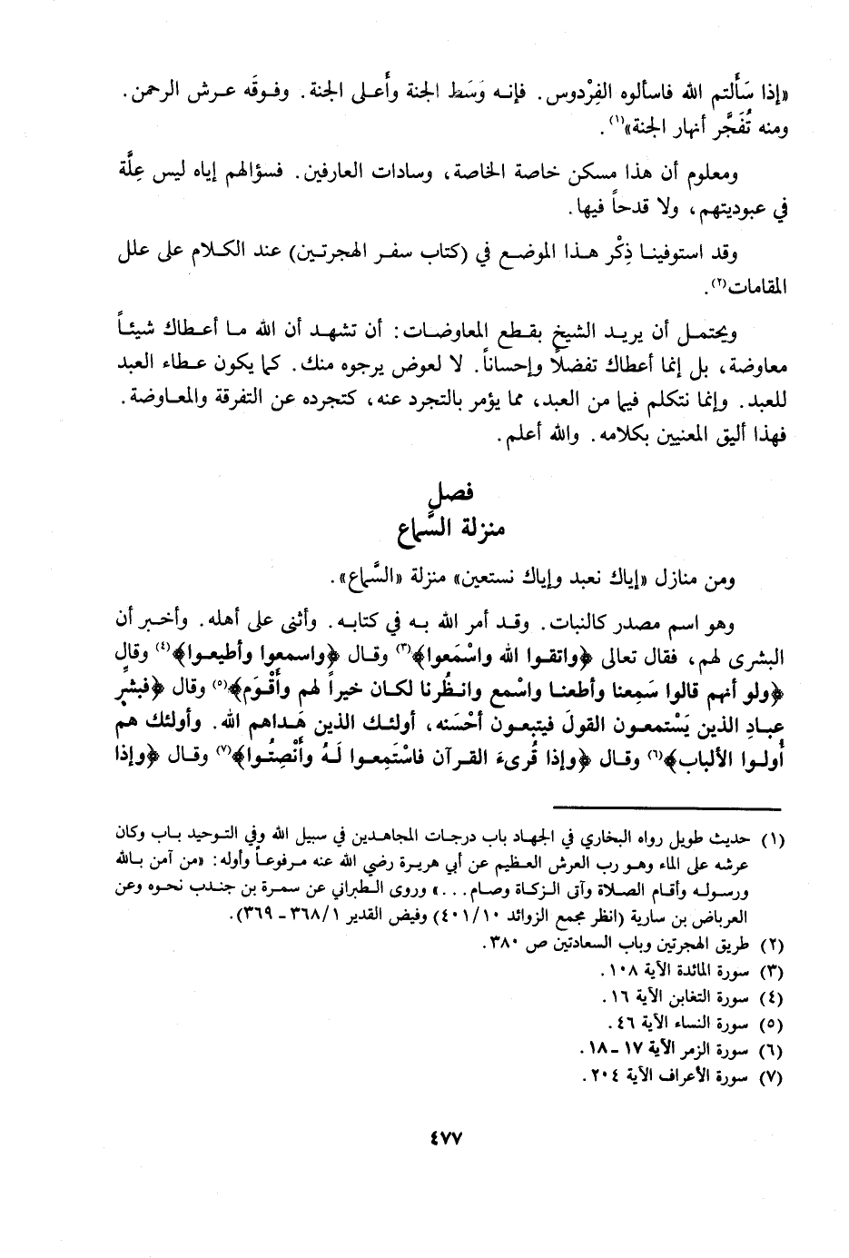 وَمِنْ مَنَازِلِ {إِيَّاكَ نَعْبُدُ وَإِيَّاكَ نَسْتَعِينُ} [الفاتحة: 5] مَنْزِلَةُ السَّمَاعِ.
