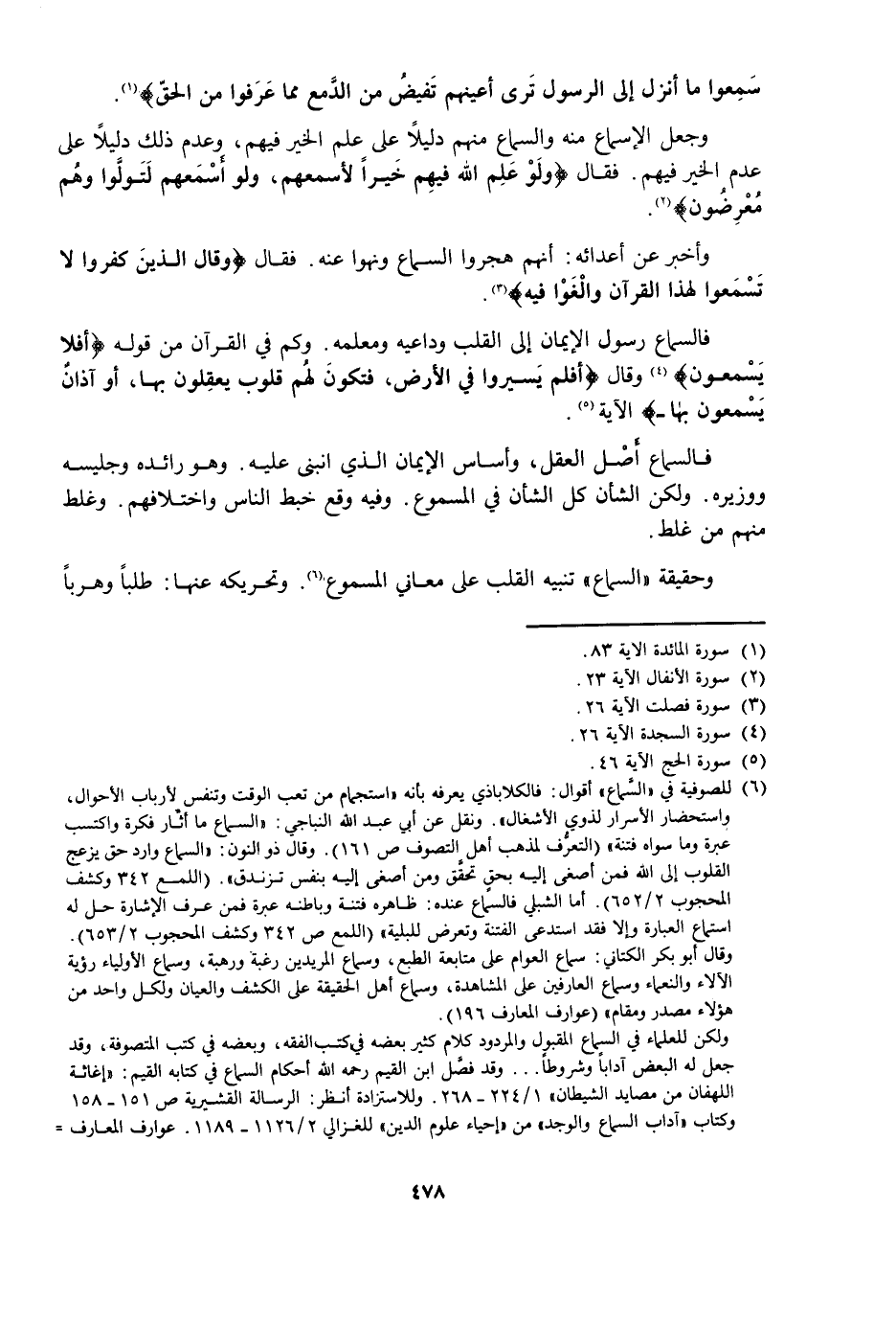 وَحَقِيقَةُ السَّمَاعِ تَنْبِيهُ الْقَلْبِ عَلَى مَعَانِي الْمَسْمُوعِ، وَتَحْرِيكُهُ عَنْهَا طَلَبًا وَهَرَبًا