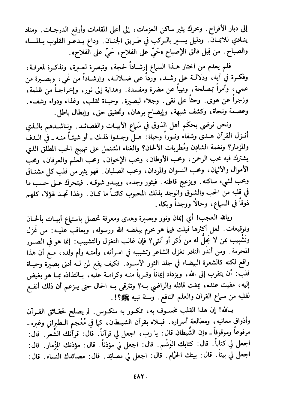 وَيَا لَلَّهِ الْعَجَبُ! أَيُّ إِيمَانٍ وَنُورٍ وَبَصِيرَةٍ وَهُدًى وَمَعْرِفَةٍ تَحْصُلُ بِاسْتِمَاعِ أَبْيَاتٍ بِأَلْحَانٍ وَتَوْقِيعَاتٍ، لَعَلَّ أَكْثَرَهَا قِيلَتْ فِيمَا هُوَ مُحَرَّمٌ يُبْغِضُهُ اللَّهُ وَرَسُولُهُ، وَيُعَاقِبُ عَلَيْهِ مِنْ غَزَلٍ وَتَشْبِيبٍ بِمَنْ لَا يَحِلُّ لَهُ مَنْ ذَكَرٍ أَوْ أُنْثَى؟ فَإِنَّ غَالِبَ التَّغَزُّلِ وَالتَّشْبِيبِ إِنَّمَا هُوَ فِي الصُّوَرِ الْمُحَرَّمَةِ، وَمِنْ أَنْدَرِ النَّادِرِ تَغَزُّلُ الشَّاعِرِ وَتَشْبِيبُهُ فِي امْرَأَتِهِ، وَأَمَتِهِ وَأُمِّ وَلَدِهِ، مَعَ أَنَّ هَذَا وَاقِعٌ لَكِنَّهُ كَالشَّعْرَةِ الْبَيْضَاءِ فِي جِلْدِ الثَّوْرِ الْأَسْوَدِ، فَكَيْفَ يَقَعُ لِمَنْ لَهُ أَدْنَى بَصِيرَةٍ وَحَيَاةِ قَلْبٍ أَنْ يَتَقَرَّبَ إِلَى اللَّهِ، وَيَزْدَادَ إِيمَانًا وَقُرْبًا مِنْهُ وَكَرَامَةً عَلَيْهِ، بِالْتِذَاذِهِ بِمَا هُوَ بَغِيضٌ إِلَيْهِ، مَقِيتٌ عِنْدَهُ، يَمْقُتُ قَائِلَهُ وَالرَّاضِيَ بِهِ؟ وَتَتَرَقَّى بِهِ الْحَالُ حَتَّى يَزْعُمَ أَنَّ ذَلِكَ أَنْفَعُ لِقَلْبِهِ مِنْ سَمَاعِ الْقُرْآنِ وَالْعِلْمِ النَّافِعِ، وَسُنَّةِ نَبِيِّهِ صَلَّى اللَّهُ عَلَيْهِ وَسَلَّمَ؟ ! .