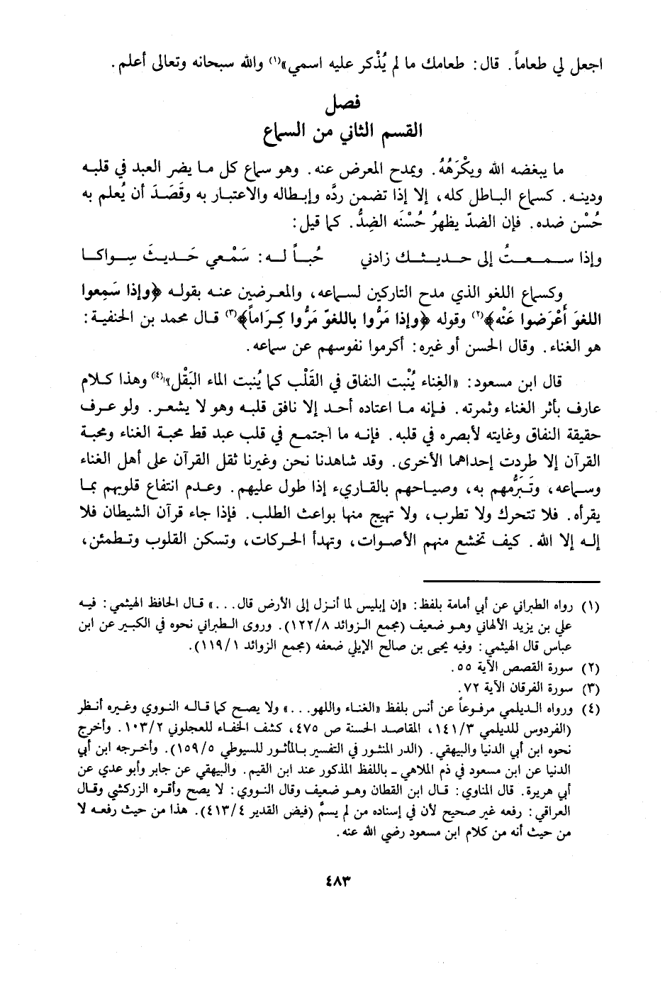 قَالَ ابْنُ مَسْعُودٍ الْغِنَاءُ يُنْبِتُ النِّفَاقَ فِي الْقَلْبِ كَمَا يُنْبِتُ الْمَاءُ الْبَقْلَ، وَهَذَا كَلَامُ عَارِفٍ بِأَثَرِ الْغِنَاءِ وَثَمَرَتِهِ، فَإِنَّهُ مَا اعْتَادَهُ أَحَدٌ إِلَّا نَافَقَ قَلْبُهُ وَهُوَ لَا يَشْعُرُ، وَلَوْ عَرَفَ حَقِيقَةَ النِّفَاقِ وَغَايَتَهُ لَأَبْصَرَهُ فِي قَلْبِهِ، فَإِنَّهُ مَا اجْتَمَعَ فِي قَلْبِ عَبْدٍ قَطُّ مَحَبَّةُ الْغِنَاءِ وَمَحَبَّةُ الْقُرْآنِ إِلَّا طَرَدَتْ إِحْدَاهُمَا الْأُخْرَى، وَقَدْ شَاهَدْنَا نَحْنُ وَغَيْرُنَا ثِقَلَ الْقُرْآنِ عَلَى أَهْلِ الْغِنَاءِ وَسَمَاعِهِ، وَتَبَرُّمَهُمْ بِهِ، وَصِيَاحَهُمْ بِالْقَارِئِ إِذَا طَوَّلَ عَلَيْهِمْ، وَعَدَمَ انْتِفَاعِ قُلُوبِهِمْ بِمَا يَقْرَؤُهُ، فَلَا تَتَحَرَّكُ وَلَا تَطْرَبُ، وَلَا تُهَيِّجُ مِنْهَا بَوَاعِثَ الطَّلَبِ، فَإِذَا جَاءَ قُرْآنُ الشَّيْطَانِ فَلَا إِلَهَ إِلَّا اللَّهُ، كَيْفَ تَخْشَعُ مِنْهُمُ الْأَصْوَاتُ، وَتَهْدَأُ الْحَرَكَاتُ، وَتَسْكُنُ الْقُلُوبُ وَتَطْمَئِنُ،