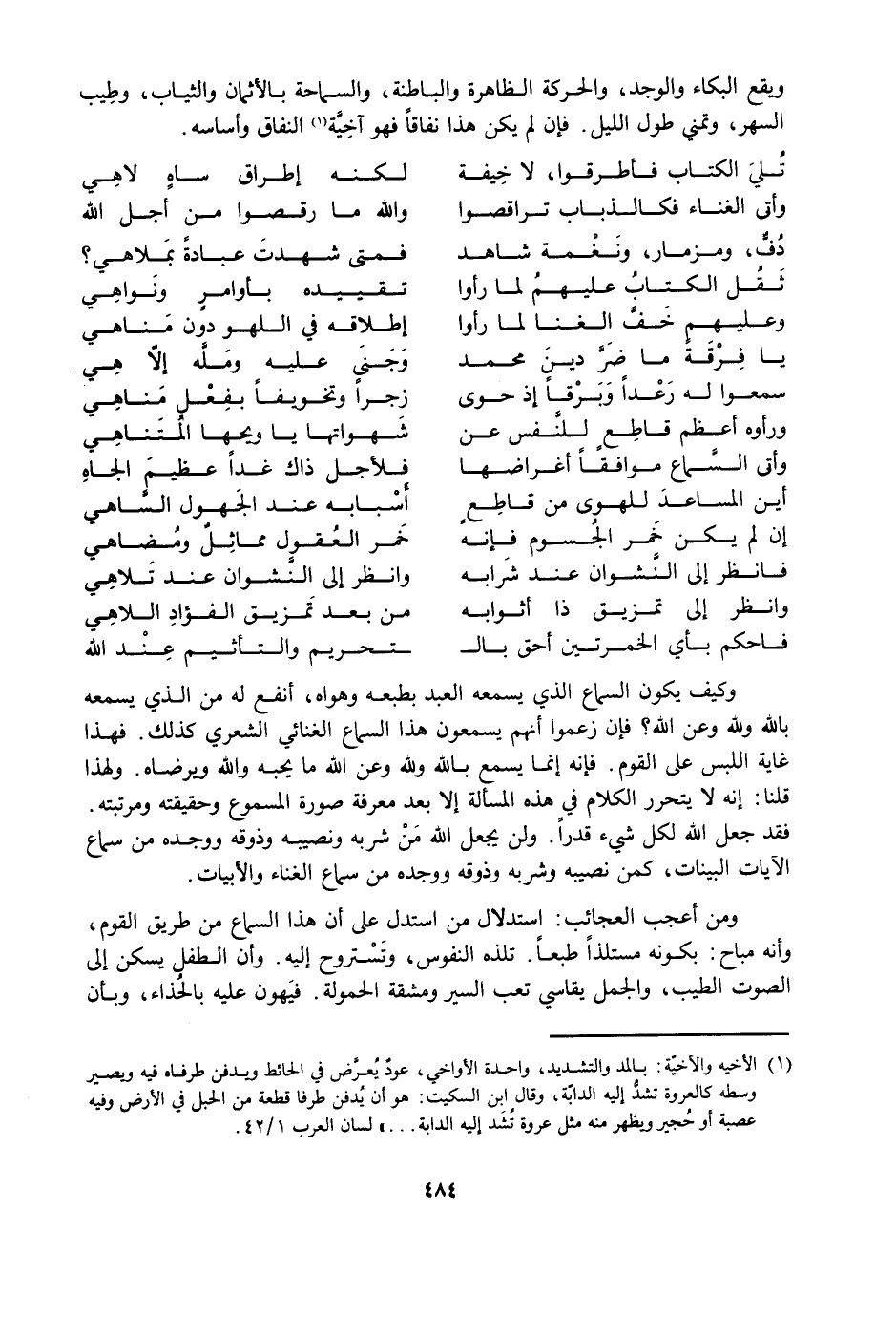 وَكَيْفَ يَكُونُ السَّمَاعُ الَّذِي يَسْمَعُهُ الْعَبْدُ بِطَبْعِهِ وَهَوَاهُ أَنْفَعَ لَهُ مِنَ الَّذِي يَسْمَعُهُ بِاللَّهِ وَلِلَّهِ وَعَنِ اللَّهِ؟ فَإِنْ زَعَمُوا أَنَّهُمْ يَسْمَعُونَ هَذَا السَّمَاعَ الْغِنَائِيَّ الشِّعْرِيَّ كَذَلِكَ، فَهَذَا غَايَةُ اللَّبْسِ عَلَى الْقَوْمِ، فَإِنَّهُ إِنَّمَا يَسْمَعُ بِاللَّهِ وَلِلَّهِ وَعَنِ اللَّهِ مَا يُحِبُّهُ اللَّهُ وَيَرْضَاهُ، وَلِهَذَا قُلْنَا: إِنَّهُ لَا يَتَحَرَّرُ الْكَلَامُ فِي هَذِهِ الْمَسْأَلَةِ إِلَّا بَعْدَ مَعْرِفَةِ صُورَةِ الْمَسْمُوعِ وَحَقِيقَتِهِ وَمَرْتَبَتِهِ، فَقَدْ جَعَلَ اللَّهُ لِكُلِّ شَيْءٍ قَدْرًا، وَلَنْ يَجْعَلَ اللَّهُ مَنْ شُرْبُهُ وَنَصِيبُهُ وَذَوْقُهُ وَوَجْدُهُ مِنْ سَمَاعِ الْآيَاتِ الْبَيِّنَاتِ كَمَنْ نَصِيبُهُ وَشُرْبُهُ وَذَوْقُهُ وَوَجْدُهُ مِنْ سَمَاعِ الْغِنَاءِ وَالْأَبِيَّاتِ.
