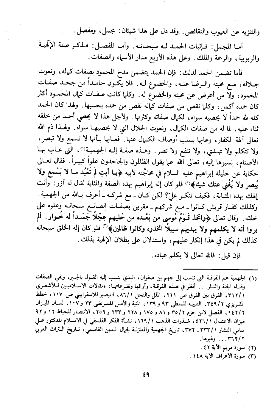 وَالتَّنْزِيهِ عَنِ الْعُيُوبِ وَالنَّقَائِصِ، وَقَدْ دَلَّ عَلَى هَذَا شَيْئَانِ: مُجْمَلٌ، وَمُفَصَّلٌ.