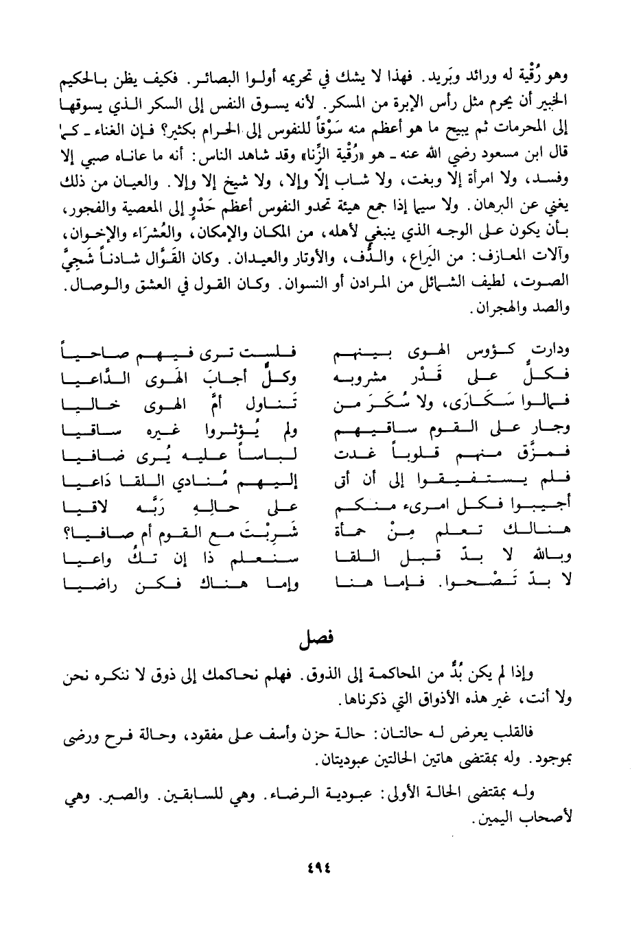 ، وَهُوَ رُقْيَةٌ لَهُ وَرَائِدٌ وَبَرِيدٌ، فَهَذَا لَا يَشُكُّ فِي تَحْرِيمِهِ أُولُو الْبَصَائِرِ، فَكَيْفَ يُظَنُّ بِالْحَكِيمِ الْخَبِيرِ أَنْ يُحَرِّمَ مِثْلَ رَأْسِ الْإِبْرَةِ مِنَ الْمُسْكِرِ لِأَنَّهُ يَسُوقُ النَّفْسَ إِلَى السُّكْرِ الَّذِي يَسُوقُهَا إِلَى الْمُحَرَّمَاتِ ثُمَّ يُبِيحُ مَا هُوَ أَعْظَمُ مِنْهُ سَوْقًا لِلنُّفُوسِ إِلَى الْحَرَامِ بِكَثِيرٍ؟ فَإِنَّ الْغِنَاءَ كَمَا قَالَ ابْنُ مَسْعُودٍ رَضِيَ اللَّهُ عَنْهُ هُوَ رُقْيَةُ الزِّنَا، وَقَدْ شَاهَدَ النَّاسُ أَنَّهُ مَا عَانَاهُ صَبِيٌّ إِلَّا وَفَسَدَ، وَلَا امْرَأَةٌ إِلَّا وَبَغَتْ، وَلَا شَابٌّ إِلَّا وَإِلَّا، وَلَا شَيْخٌ إِلَّا وَإِلَّا، وَالْعِيَانُ مِنْ ذَلِكَ يُغْنِي عَنِ الْبُرْهَانِ، وَلَاسِيَّمَا إِذَا جَمَعَ هَيْئَةً تَحْدُو النُّفُوسَ أَعْظَمَ حَدْوٍ إِلَى الْمَعْصِيَةِ وَالْفُجُورِ، بِأَنْ يَكُونَ عَلَى الْوَجْهِ الَّذِي يَنْبَغِي لِأَهْلِهِ، مِنَ الْمَكَانِ وَالْإِمْكَانِ، وَالْعُشَرَاءِ وَالْإِخْوَانِ، وَآلَاتِ الْمَعَازِفِ مِنَ الْيَرَاعِ، وَالدُّفِّ، وَالْأَوْتَارِ وَالْعِيدَانِ، وَكَانَ الْقَوَّالُ شَادِنًا شَجِيَّ الصَّوْتِ، لِطَيْفَ الشَّمَائِلِ مِنَ الْمُرْدَانِ أَوِ النِّسْوَانِ، وَكَانَ الْقَوْلُ فِي الْعِشْقِ وَالْوِصَالِ، وَالصَّدِّ وَالْهِجْرَانِ.