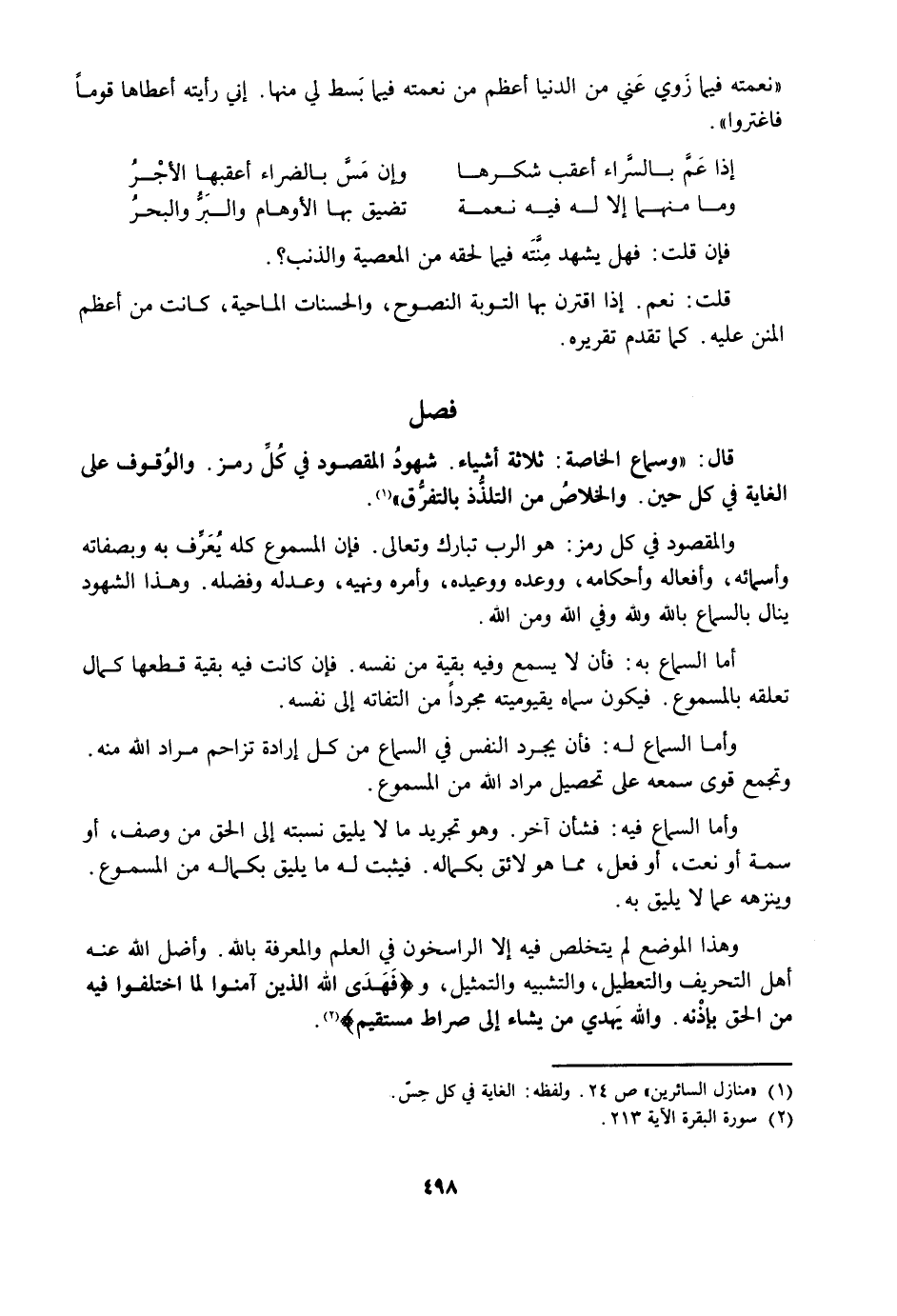 وَهَذَا الْمَوْضِعُ لَمْ يَتَخَلَّصْ فِيهِ إِلَّا الرَّاسِخُونَ فِي الْعِلْمِ وَالْمَعْرِفَةِ بِاللَّهِ، وَأَضَلَّ اللَّهُ عَنْهُ أَهْلَ التَّحْرِيفِ وَالتَّعْطِيلِ، وَالتَّشْبِيهِ وَالتَّمْثِيلِ، وَ {فَهَدَى اللَّهُ الَّذِينَ آمَنُوا لِمَا اخْتَلَفُوا فِيهِ مِنَ الْحَقِّ بِإِذْنِهِ وَاللَّهُ يَهْدِي مَنْ يَشَاءُ إِلَى صِرَاطٍ مُسْتَقِيمٍ} [البقرة: 213] .