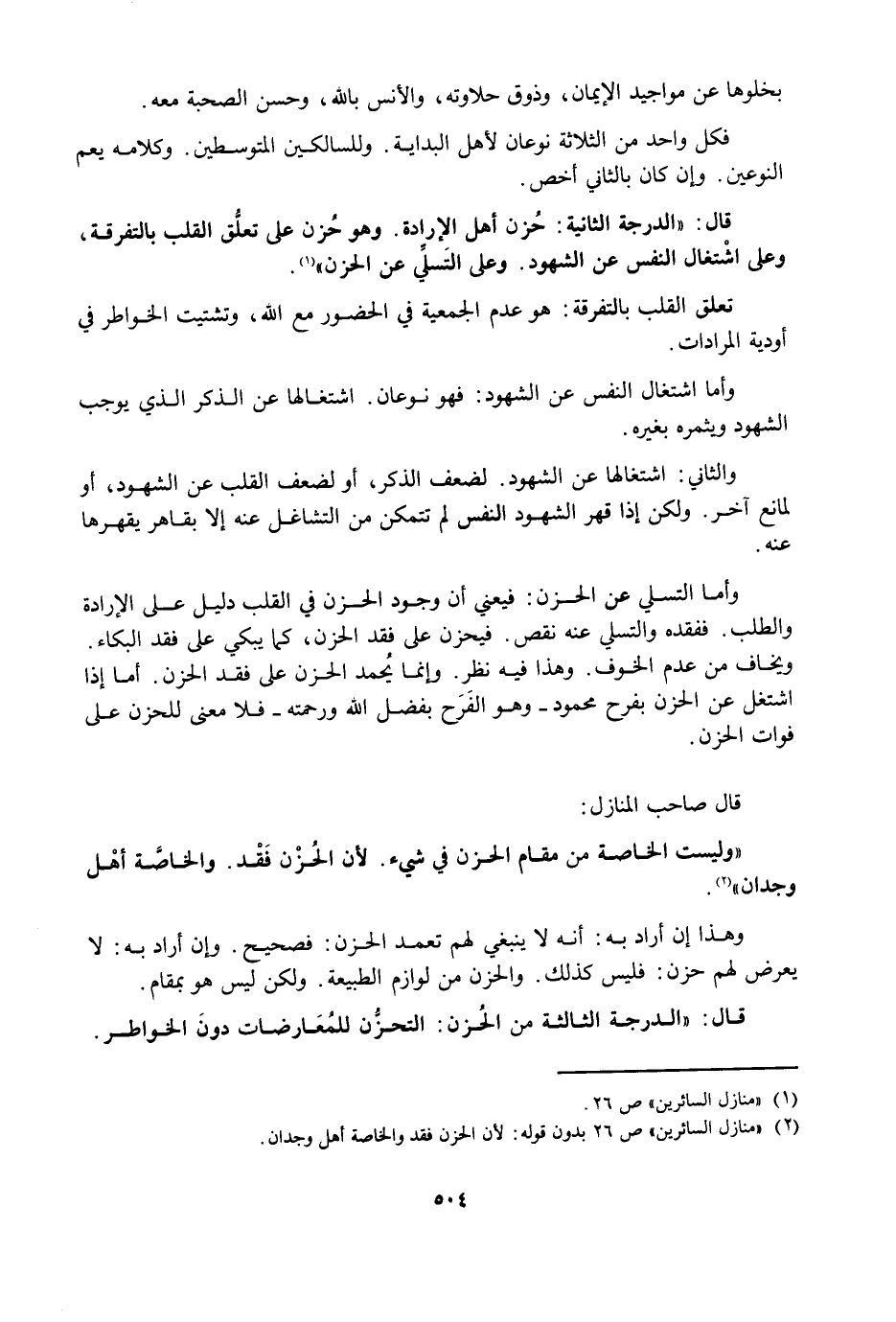 قَالَ: الدَّرَجَةُ الثَّانِيَةُ حُزْنُ أَهْلِ الْإِرَادَةِ، وَهُوَ حُزْنٌ عَلَى تَعَلُّقِ الْقَلْبِ بِالتَّفْرِقَةِ، وَعَلَى اشْتِغَالِ النَّفْسِ عَنِ الشُّهُودِ، وَعَلَى التَّسَلِّي عَنِ الْحُزْنِ.