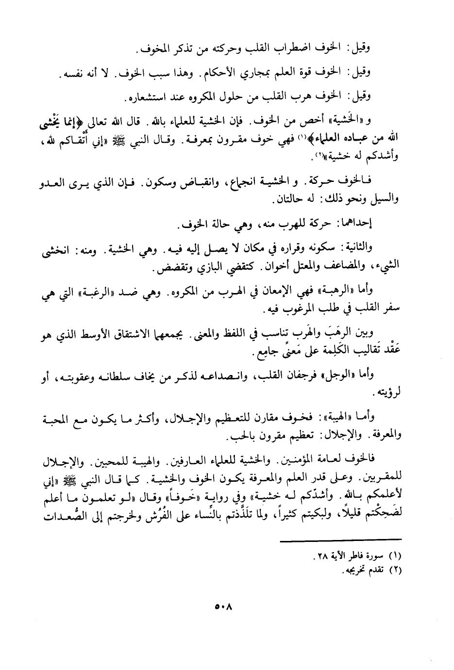 فَالْخَوْفُ لِعَامَّةِ الْمُؤْمِنِينَ، وَالْخَشْيَةُ لِلْعُلَمَاءِ الْعَارِفِينَ، وَالْهَيْبَةُ لِلْمُحِبِّينَ، وَالْإِجْلَالُ لِلْمُقَرَّبِينَ، وَعَلَى قَدْرِ الْعِلْمِ وَالْمَعْرِفَةِ يَكُونُ الْخَوْفُ وَالْخَشْيَةُ، كَمَا قَالَ النَّبِيُّ صَلَّى اللَّهُ عَلَيْهِ وَسَلَّمَ «إِنِّي لَأَعْلَمُكُمْ بِاللَّهِ، وَأَشَدُّكُمْ لَهُ خَشْيَةً» وَفِي رِوَايَةٍ " خَوْفًا " وَقَالَ «لَوْ تَعْلَمُونَ مَا أَعْلَمُ لَضَحِكْتُمْ قَلِيلًا، وَلَبَكَيْتُمْ كَثِيرًا، وَلَمَا تَلَذَّذْتُمْ بِالنِّسَاءِ عَلَى الْفُرُشِ وَلَخَرَجْتُمْ إِلَى الصُّعُدَاتِ