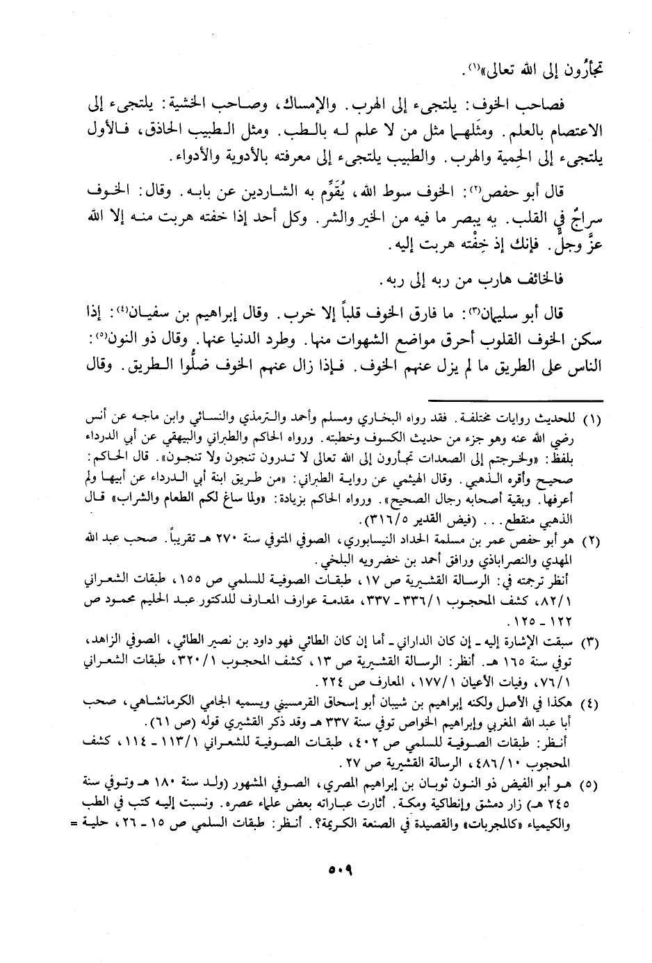 قَالَ أَبُو حَفْصٍ: الْخَوْفُ سَوْطُ اللَّهِ، يُقَوِّمُ بِهِ الشَّارِدِينَ عَنْ بَابِهِ، وَقَالَ: الْخَوْفُ سِرَاجٌ فِي الْقَلْبِ، بِهِ يُبْصَرُ مَا فِيهِ مِنَ الْخَيْرِ وَالشَّرِّ، وَكُلُّ أَحَدٍ إِذَا خِفْتَهُ هَرَبْتَ مِنْهُ إِلَّا اللَّهَ عَزَّ وَجَلَّ، فَإِنَّكَ إِذْ خِفْتَهُ هَرَبْتَ إِلَيْهِ.