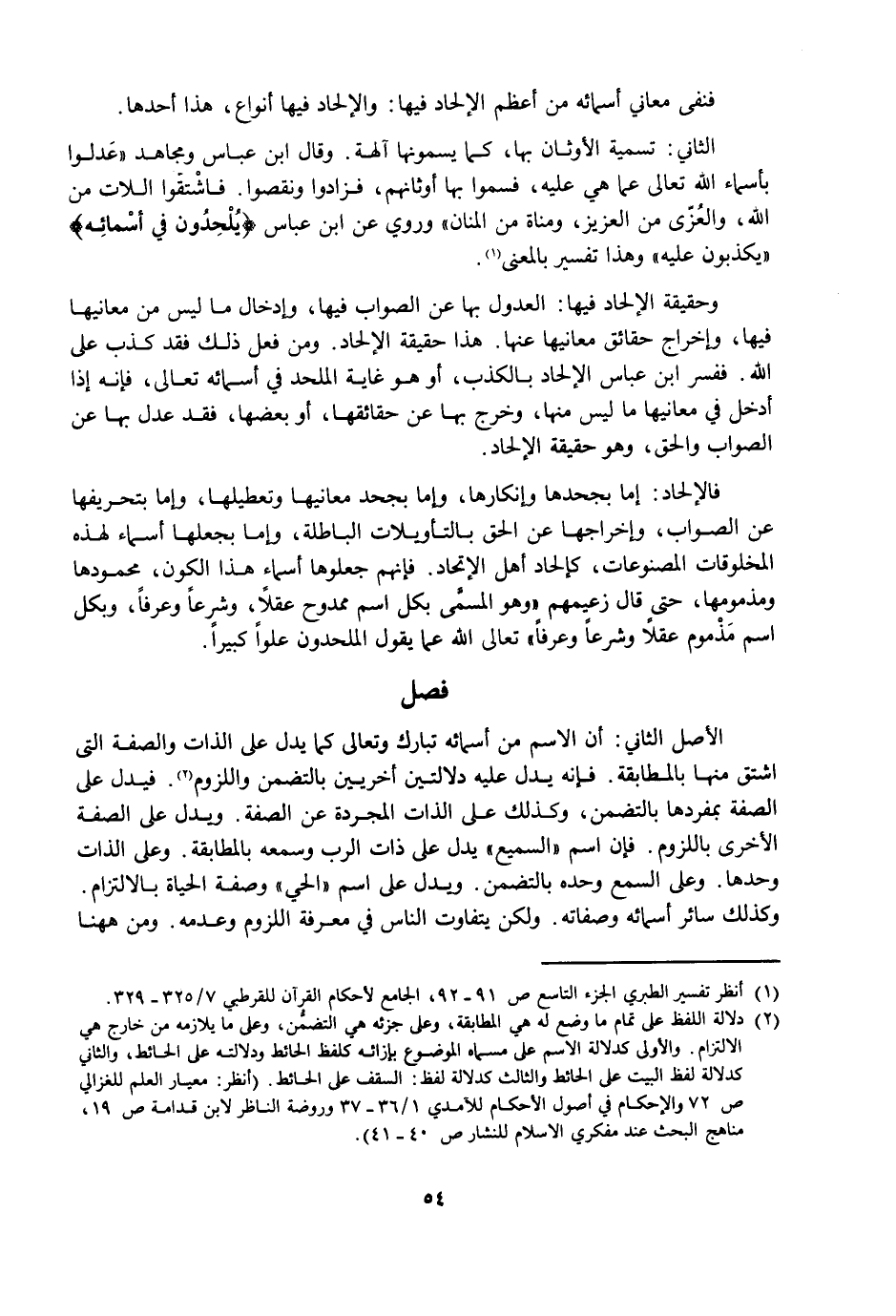 الْأَصْلُ الثَّانِي: أَنَّ الِاسْمَ مِنْ أَسْمَائِهِ تَبَارَكَ وَتَعَالَى كَمَا يَدُلُّ عَلَى الذَّاتِ وَالصِّفَةِ الَّتِي اشْتُقَّ مِنْهَا بِالْمُطَابَقَةِ، فَإِنَّهُ يَدُلُّ عَلَيْهِ دَلَالَتَيْنِ أُخْرَيَيْنِ بِالتَّضَمُّنِ وَاللُّزُومِ، فَيَدُلُّ عَلَى الصِّفَةِ بِمُفْرَدِهَا بِالتَّضَمُّنِ، وَكَذَلِكَ عَلَى الذَّاتِ الْمُجَرَّدَةِ عَنِ الصِّفَةِ، وَيَدُلُّ عَلَى الصِّفَةِ الْأُخْرَى بِاللُّزُومِ، فَإِنَّ اسْمَ السَّمِيعِ يَدُلُّ عَلَى ذَاتِ الرَّبِّ وَسَمْعِهِ بِالْمُطَابَقَةِ، وَعَلَى الذَّاتِ وَحْدَهَا، وَعَلَى السَّمْعِ وَحْدَهُ بِالتَّضَمُّنِ، وَيَدُلُّ عَلَى اسْمِ الْحَيِّ وَصِفَةِ الْحَيَاةِ بِالِالْتِزَامِ، وَكَذَلِكَ سَائِرُ أَسْمَائِهِ وَصِفَاتِهِ، وَلَكِنْ يَتَفَاوَتُ النَّاسُ فِي مَعْرِفَةِ اللُّزُومِ وَعَدَمِهِ، وَمِنْ هَاهُنَا