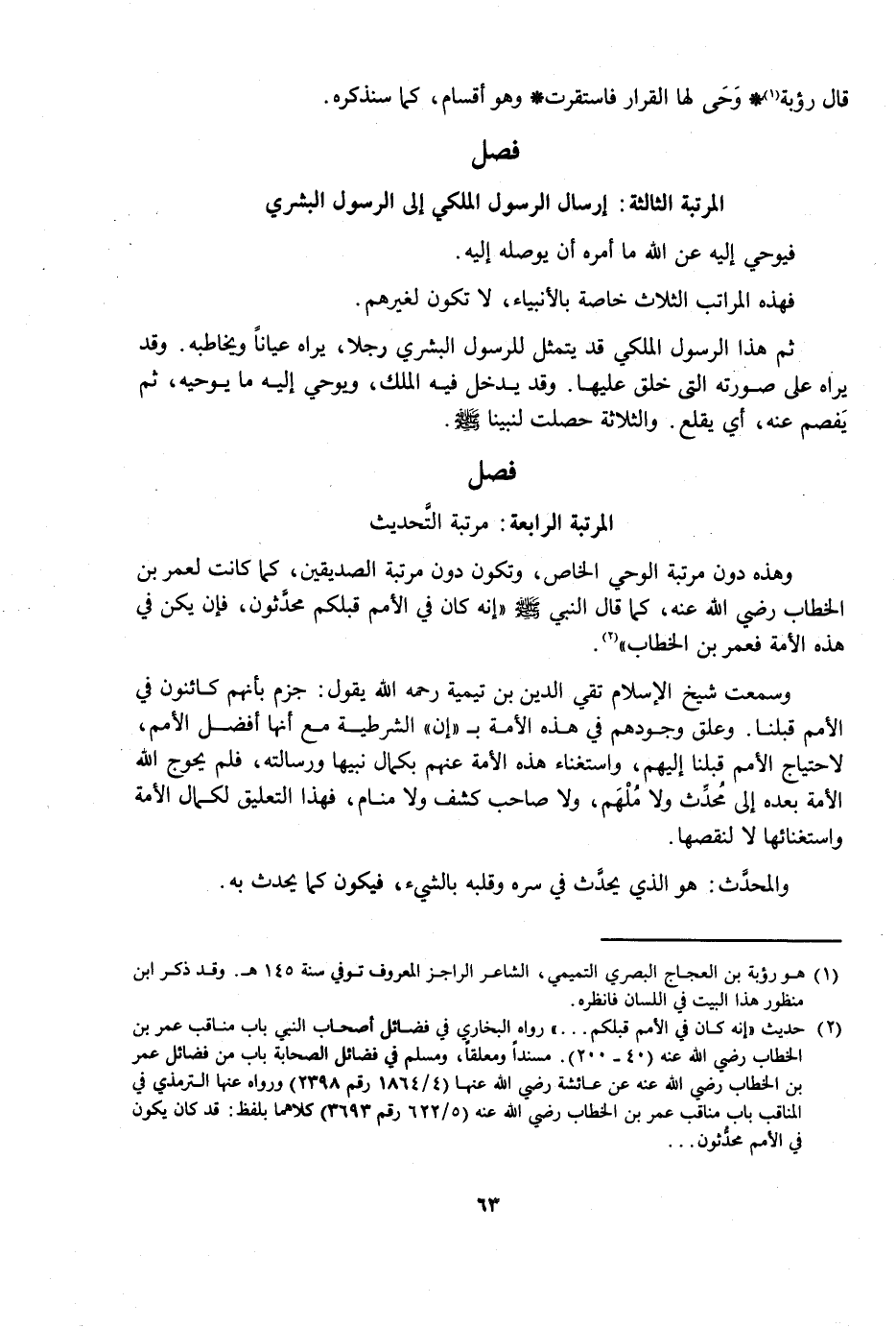 وَهَذِهِ دُونَ مَرْتَبَةِ الْوَحْيِ الْخَاصِّ، وَتَكُونُ دُونَ مَرْتَبَةِ الصِّدِّيقِينَ، كَمَا كَانَتْ لِ عُمَرَ بْنِ الْخَطَّابِ رَضِيَ اللَّهُ عَنْهُ، كَمَا قَالَ النَّبِيُّ صَلَّى اللَّهُ عَلَيْهِ وَسَلَّمَ «إِنَّهُ كَانَ فِي الْأُمَمِ قَبْلَكُمْ مُحَدَّثُونَ، فَإِنْ يَكُنْ فِي هَذِهِ الْأُمَّةِ فَعُمَرُ بْنُ الْخَطَّابِ» .