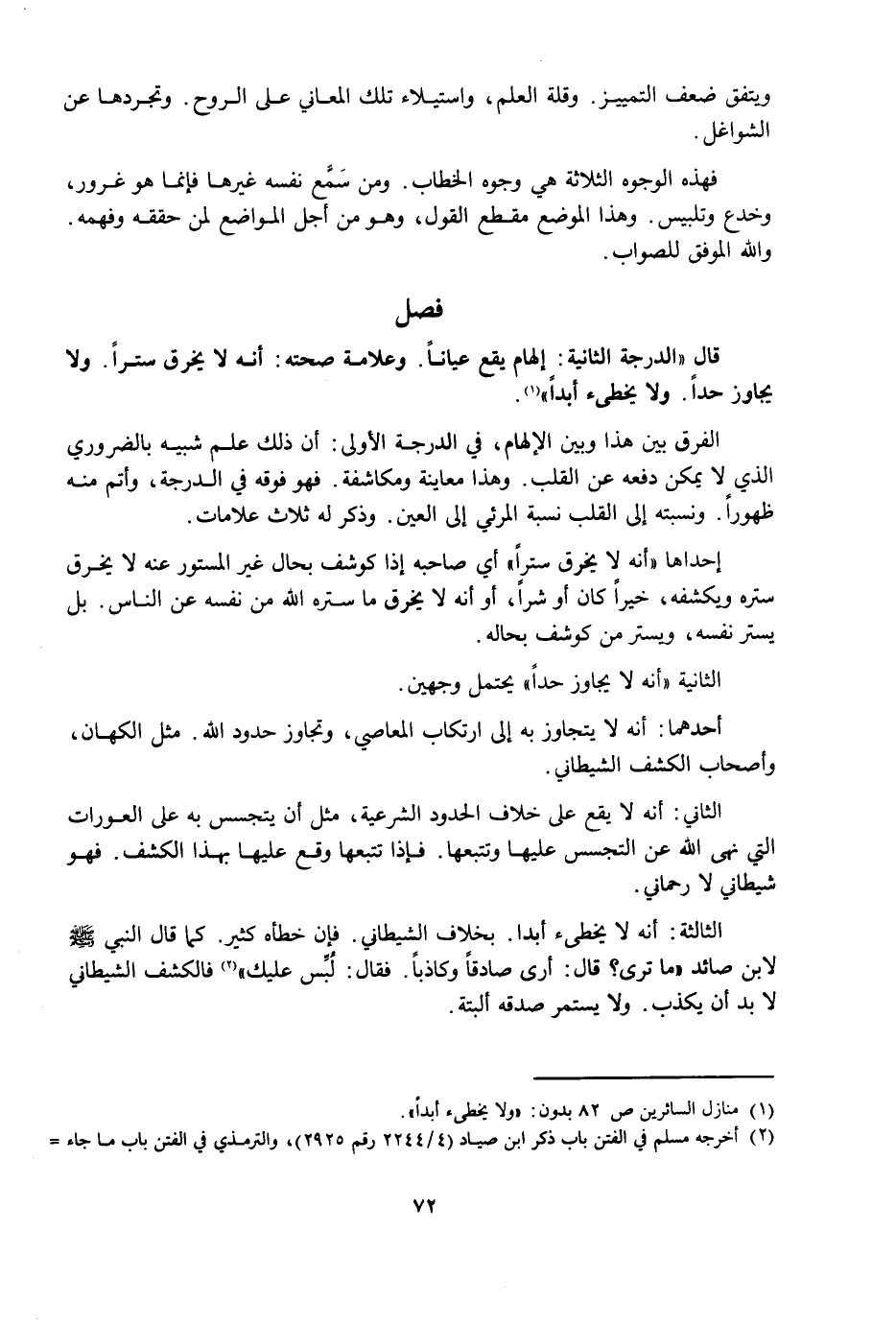 قَالَ: " الدَّرَجَةُ الثَّانِيَةُ: إِلْهَامٌ يَقَعُ عِيَانًا، وَعَلَامَةُ صِحَّتِهِ أَنَّهُ لَا يَخْرِقُ سِتْرًا، وَلَا يُجَاوِزُ حَدًّا، وَلَا يُخْطِئُ أَبَدًا ".