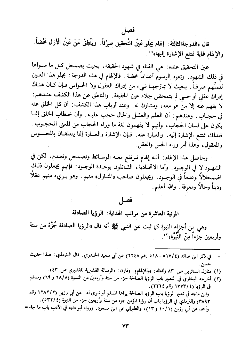 عَيْنُ التَّحْقِيقِ عِنْدَهُ هِيَ الْفَنَاءُ فِي شُهُودِ الْحَقِيقَةِ، بِحَيْثُ يَضْمَحِلُّ كُلُّ مَا سِوَاهَا فِي ذَلِكَ الشُّهُودِ، وَتَعُودُ الرُّسُومُ أَعْدَامًا مَحْضَةً، فَالْإِلْهَامُ فِي هَذِهِ الدَّرَجَةِ يَجْلُو هَذَا الْعَيْنَ لِلْمُلْهَمِ صَرْفًا، بِحَيْثُ لَا يُمَازِجُهَا شَيْءٌ مِنْ إِدْرَاكِ الْعُقُولِ وَلَا الْحَوَاسِّ، فَإِنْ كَانَ هُنَاكَ إِدْرَاكٌ عَقْلِيٌّ أَوْ حِسِّيٌّ لَمْ يَتَمَحَّضْ جَلَاءُ عَيْنِ الْحَقِيقَةِ، وَالنَّاطِقُ عَنْ هَذَا الْكَشْفِ عِنْدَهُمْ لَا يَفْهَمُ عَنْهُ إِلَّا مَنْ هُوَ مَعَهُ، وَمُشَارِكٌ لَهُ، وَعِنْدَ أَرْبَابِ هَذَا الْكَشْفِ أَنَّ كُلَّ الْخَلْقِ عَنْهُ فِي حِجَابٍ، وَعِنْدَهُمْ أَنَّ الْعِلْمَ وَالْعَقْلَ وَالْحَالَ حُجُبٌ عَلَيْهِ، وَأَنَّ خِطَابَ الْخَلْقِ إِنَّمَا يَكُونُ عَلَى لِسَانِ الْحِجَابِ، وَأَنَّهُمْ لَا يَفْهَمُونَ لُغَةَ مَا وَرَاءَ الْحِجَابِ مِنَ الْمَعْنَى الْمَحْجُوبِ، فَلِذَلِكَ تَمْتَنِعُ الْإِشَارَةُ إِلَيْهِ، وَالْعِبَارَةُ عَنْهُ، فَإِنَّ الْإِشَارَةَ وَالْعِبَارَةَ إِنَّمَا يَتَعَلَّقَانِ بِالْمَحْسُوسِ وَالْمَعْقُولِ، وَهَذَا أَمْرٌ وَرَاءَ الْحِسِّ وَالْعَقْلِ.