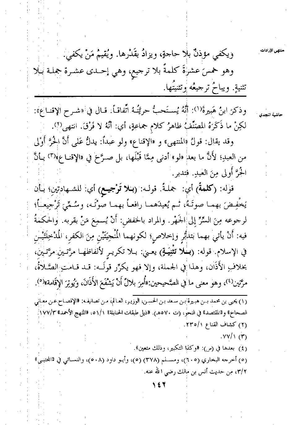 وَيَكْفِي مُؤَذِّنٌ بِلَا حَاجَةٍ وَيُزَادُ بِقَدْرِهَا وَيُقِيمُ مَنْ يَكْفِي وَهُوَ خَمْسَ عَشْرَةَ كَلِمَةً بِلَا تَرْجِيعٍ وَهِيَ إحْدَى عَشْرَةَ جُمْلَةً بِلَا تَثْنِيَةٍ وَيُبَاحُ تَرْجِيعُهُ وَتَثْنِيَتُهَا