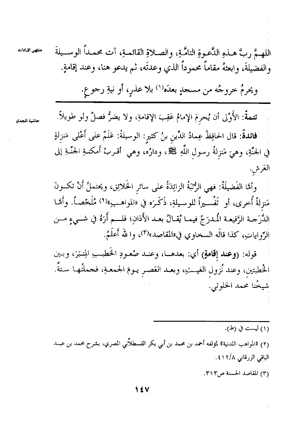 اللَّهُمَّ رَبَّ هَذِهِ الدَّعْوَةِ التَّامَّةِ وَالصَّلَاةِ الْقَائِمَةِ آتِ مُحَمَّدًا الْوَسِيلَةَ وَالْفَضِيلَةَ وَابْعَثْهُ مَقَامًا مَحْمُودًا الَّذِي وَعَدْته ثُمَّ يَدْعُو هُنَا وَعِنْدَ إقَامَةٍ وَيَحْرُمُ خُرُوجُهُ مِنْ مَسْجِدٍ بَعْدَهُ بِلَا عُذْرٍ أَوْ نِيَّةِ رُجُوعٍ