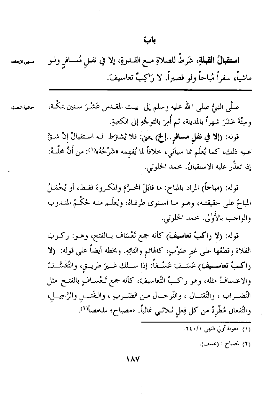 استقبال القبلة شرط للصلاة مَعَ الْقُدْرَةِ إلَّا فِي نَفْلِ مُسَافِرٍ وَلَوْ مَاشِيًا سَفَرًا مُبَاحًا وَلَوْ قَصِيرًا لَا تَعَاسِيفَ