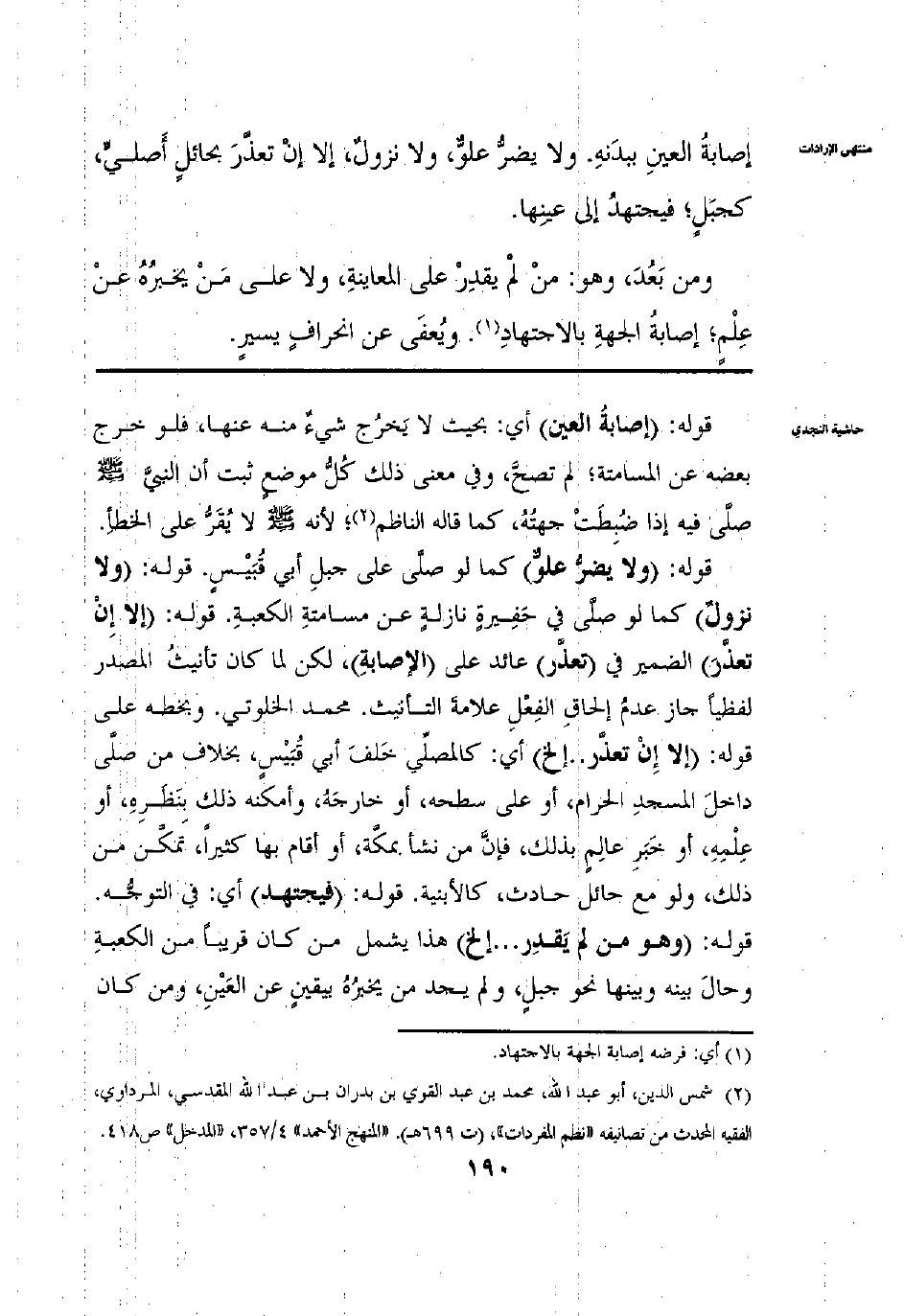 إصَابَةُ الْعَيْنِ بِبَدَنِهِ وَلَا يَضُرُّ عُلُوٌّ ونُزُولٌ إلَّا إنْ تَعَذَّرَ بِحَائِلٍ أَصْلِيٍّ كَجَبَلٍ فيَجْتَهِدُ إلَى عَيْنِهَا ومَنْ بَعُدَ هُوَ مَنْ لَمْ يَقْدِرْ عَلَى الْمُعَايَنَةِ لَا عَلَى مَنْ يُخْبِرُهُ عَنْ عِلْمِ إصَابَةِ الْجِهَةِ بِالِاجْتِهَادِ وَيُعْفَى عَنْ انْحِرَافٍ يَسِيرٍ