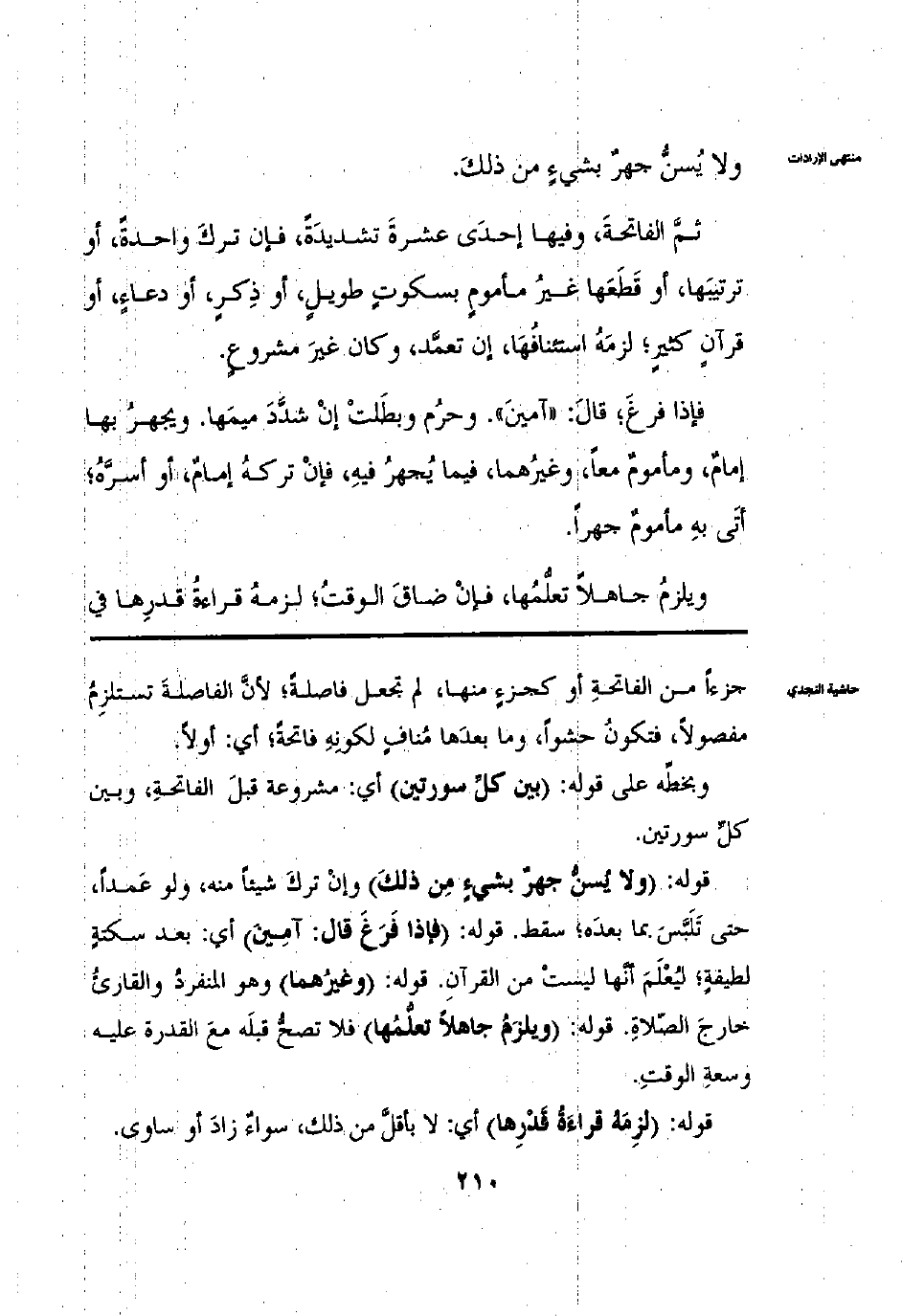 وَلَا يُسَنُّ جَهْرٌ بِشَيْءٍ مِنْ ذَلِكَ الْحَمْدُ لِلَّهِ رَبِّ الْعَالَمِينَ ثُمَّ الْفَاتِحَةَ وَفِيهَا إحْدَى عَشْرَةَ تَشْدِيدَةً فَإِنْ تَرَكَ وَاحِدَةً أَوْ تَرْتِيبَهَا أَوْ قَطَعَهَا غَيْرُ مَأْمُومٍ بِسُكُوتٍ طَوِيلٍ أَوْ ذِكْرٍ كَثِيرٍ أَوْ دُعَاءٍ أَوْ قُرْآنٍ كَثِيرٍ لَزِمَهُ اسْتِئْنَافُهَا إنْ تَعَمَّدَ وَكَانَ غَيْرَ مَشْرُوعٍ فَإِذَا فَرَغَ قَالَ آمِينَ وَحَرُمَ وَبَطَلَتْ إنْ شَدَّدَ مِيمَهَا وَيَجْهَرُ بِهَا إمَامٌ وَمَأْمُومٌ مَعًا وَيَجْهَرُ بِهَا غَيْرُهُمَا فَإِنْ تَرَكَهُ إمَامٌ أَوْ أَسَرَّهُ أَتَى بِهِ مَأْمُومٌ جَهْرًا وَيَلْزَمُ جَاهِلًا تَعَلُّمُهَا فَإِنْ ضَاقَ الْوَقْتُ لَزِمَهُ قِرَاءَةُ قَدْرِهَا فِي