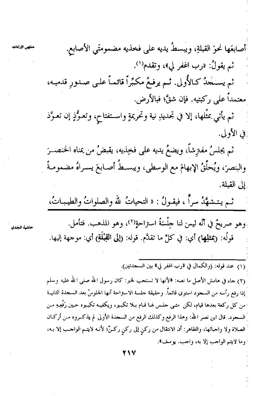 أَصَابِعَهَا نَحْوَ الْقِبْلَةِ وَيَبْسُطُ يَدَيْهِ عَلَى فَخِذَيْهِ مَضْمُومَتَيْ الْأَصَابِعِ ثُمَّ يَقُولُ: رَبِّ اغْفِرْ لِي وَتَقَدَّمَ ثُمَّ يَسْجُدُ كَالْأُولَى ثُمَّ يَرْفَعُ مُكَبِّرًا قَائِمًا عَلَى صُدُورِ قَدَمَيْهِ مُعْتَمِدًا عَلَى رُكْبَتَيْهِ إذَا نَهَضَ نَهَضَ عَلَى رُكْبَتَيْهِ وَاعْتَمَدَ عَلَى فَخِذَيْهِ فَإِنْ شَقَّ فَبِالْأَرْضِ ثُمَّ يَأْتِي بمِثْلِهَا إلَّا فِي تَجْدِيدِ نِيَّةٍ فَيَكْفِي وَتَحْرِيمِهِ وَاسْتِفْتَاحٍ وَتَعَوُّذٍ إنْ تَعَوَّذَ فِي الْأُولَى ثُمَّ يَجْلِسُ مُفْتَرِشًا وَيَضَعُ يَدَيْهِ عَلَى فَخِذَيْهِ يَقْبِضُ مِنْ يُمْنَاهُ: الْخِنْصَرِ وَالْبِنْصِرِ، وَيُحَلِّقُ الْإِبْهَامَ مَعَ لْوُسْطَى وَيَبْسُطُ أَصَابِعَ يُسْرَاهُ مَضْمُومَةً إلَى الْقِبْلَةِ ثُمَّ يَتَشَهَّدُ سِرًّا فَيَقُولُ: التَّحِيَّاتُ لِلَّهِ وَالصَّلَوَاتُ وَالطَّيِّبَاتُ