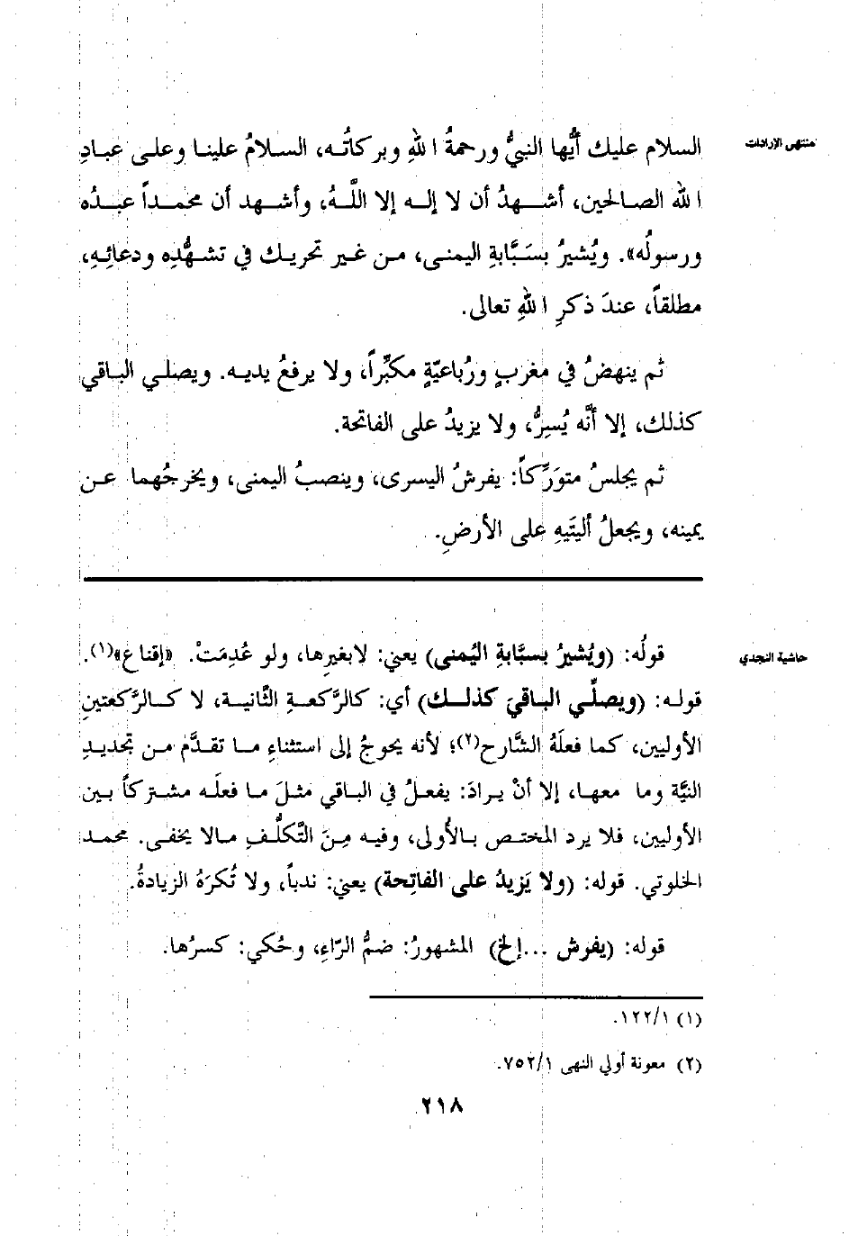 السَّلَامُ عَلَيْكَ أَيُّهَا النَّبِيُّ وَرَحْمَةُ اللَّهِ وَبَرَكَاتُهُ السَّلَامُ عَلَيْنَا وَعَلَى عِبَادِ اللَّهِ الصَّالِحِينَ أَشْهَدُ أَنْ لَا إلَهَ إلَّا اللَّهُ وَأَشْهَدُ أَنَّ مُحَمَّدًا عَبْدُهُ وَرَسُولُهُ وَيُشِيرُ بِسَبَّابَةِ الْيُمْنَى مِنْ غَيْرِ تَحْرِيكٍ فِي تَشَهُّدِهِ وَدُعَائِهِ مُطْلَقًا عِنْدَ ذِكْرِ اللَّهِ تَعَالَى ثُمَّ يَنْهَضُ فِي مَغْرِبٍ وَرُبَاعِيَّةٍ مُكَبِّرًا وَلَا يَرْفَعُ يَدَيْهِ وَيُصَلِّي الْبَاقِي كَذَلِكَ إلَّا أَنَّهُ يُسِرُّ وَلَا يَزِيدُ عَلَى الْفَاتِحَةِ ثُمَّ يَجْلِسُ مُتَوَرِّكًا يَفْرِشَ الْيُسْرَى وَيَنْصِبَ الْيُمْنَى وَيُخْرِجَهُمَا عَنْ يَمِينِهِ، وَيَجْعَلُ أَلْيَتَيْهِ عَلَى الْأَرْضِ