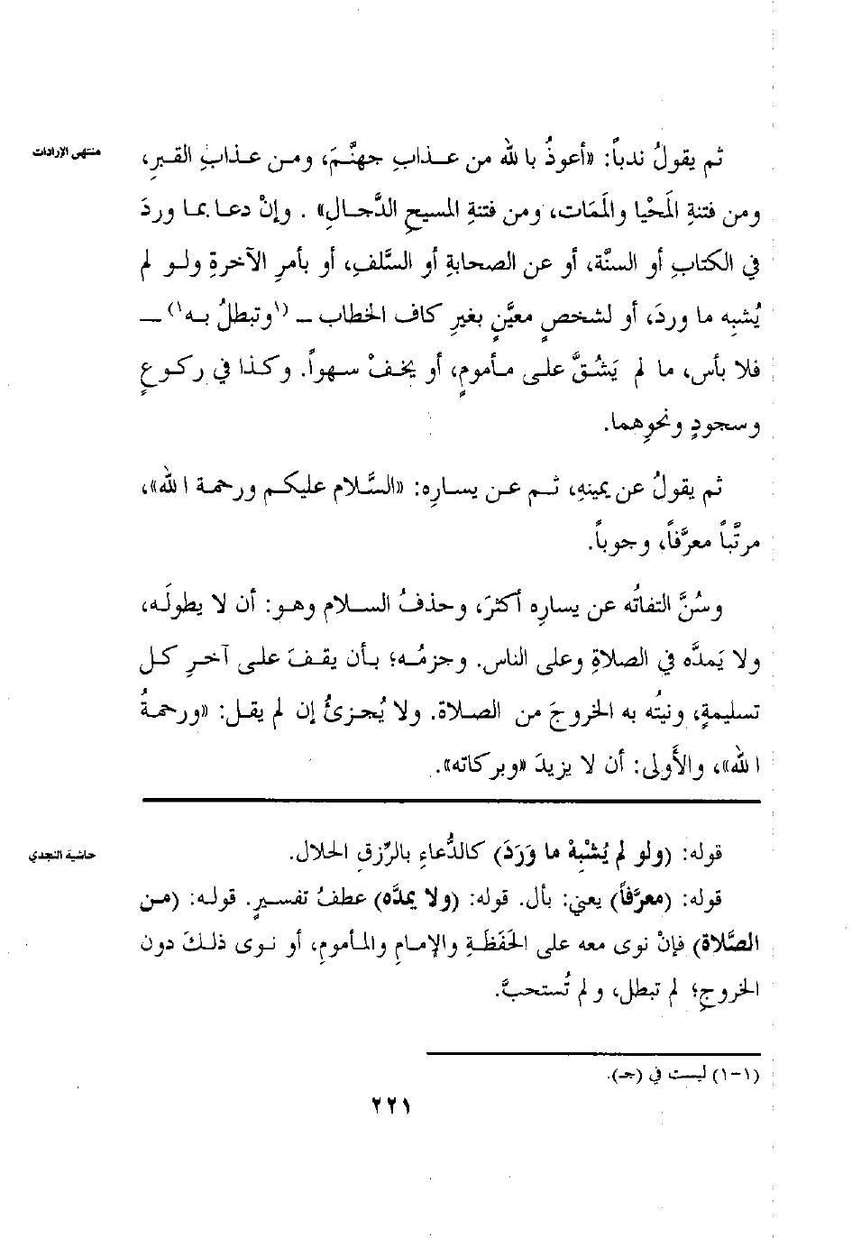 ثُمَّ يَقُولُ نَدْبًا: أَعُوذُ بِاَللَّهِ مِنْ عَذَابِ جَهَنَّمَ وَمِنْ عَذَابِ الْقَبْرِ، وَمِنْ فِتْنَةِ الْمَحْيَا وَالْمَمَاتِ وَمِنْ فِتْنَةِ الْمَسِيحِ الدَّجَّالِ وَإِنْ دَعَا بِمَا وَرَدَ فِي الْكِتَابِ أَوْالسُّنَّةِ أَوْوَرَدَ عَنْ الصَّحَابَةِ أَوْالسَّلَفِ أَوْبِأَمْرِ الْآخِرَةِ وَلَوْ لَمْ يُشْبِهْ مَا وَرَدَ ثُمَّ يَدْعُو لِنَفْسِهِ بِمَا بَدَا لَهُ أَوْ لِشَخْصٍ مُعَيَّنٍ بِغَيْرِ كَافِ الْخِطَابِ وَتَبْطُلُ بِهِ فَلَا بَاسَ مَا لَمْ يَشُقَّ عَلَى مَأْمُومٍ ;، أَوْ يَخَفْ سَهْوًا وَكَذَا رُكُوعٍ وَسُجُودٍ وَنَحْوِهِمَا ثُمَّ يَقُولُ عَنْ يَمِينِهِ ثُمَّ عَنْ يَسَارِهِ السَّلَامُ عَلَيْكُمْ وَرَحْمَةُ اللَّهِ مُرَتَّبًا، مُعَرَّفًا وُجُوبًا وَسُنَّ الْتِفَاتُهُ عَنْ يَسَارِهِ أَكْثَرَ وَحَذْفُ السَّلَامِ وَهُوَأَنْ لَا يُطَوِّلَهُ وَلَا يَمُدُّهُ فِي الصَّلَاةِ وَلَا عَلَى النَّاسِ وَجَزْمُهُ بِأَنْ يَقِفَ عَلَى آخِرِ كُلِّ تَسْلِيمَةٍ وَنِيَّتُهُ بِهِ الْخُرُوجَ مِنْ الصَّلَاةِ وَلَا يُجْزِئُ إنْ لَمْ يَقُلْ: وَرَحْمَةُ اللَّهِ وَالْأَوْلَى: أَنْ لَا يَزِيدَ وَبَرَكَاتُهُ