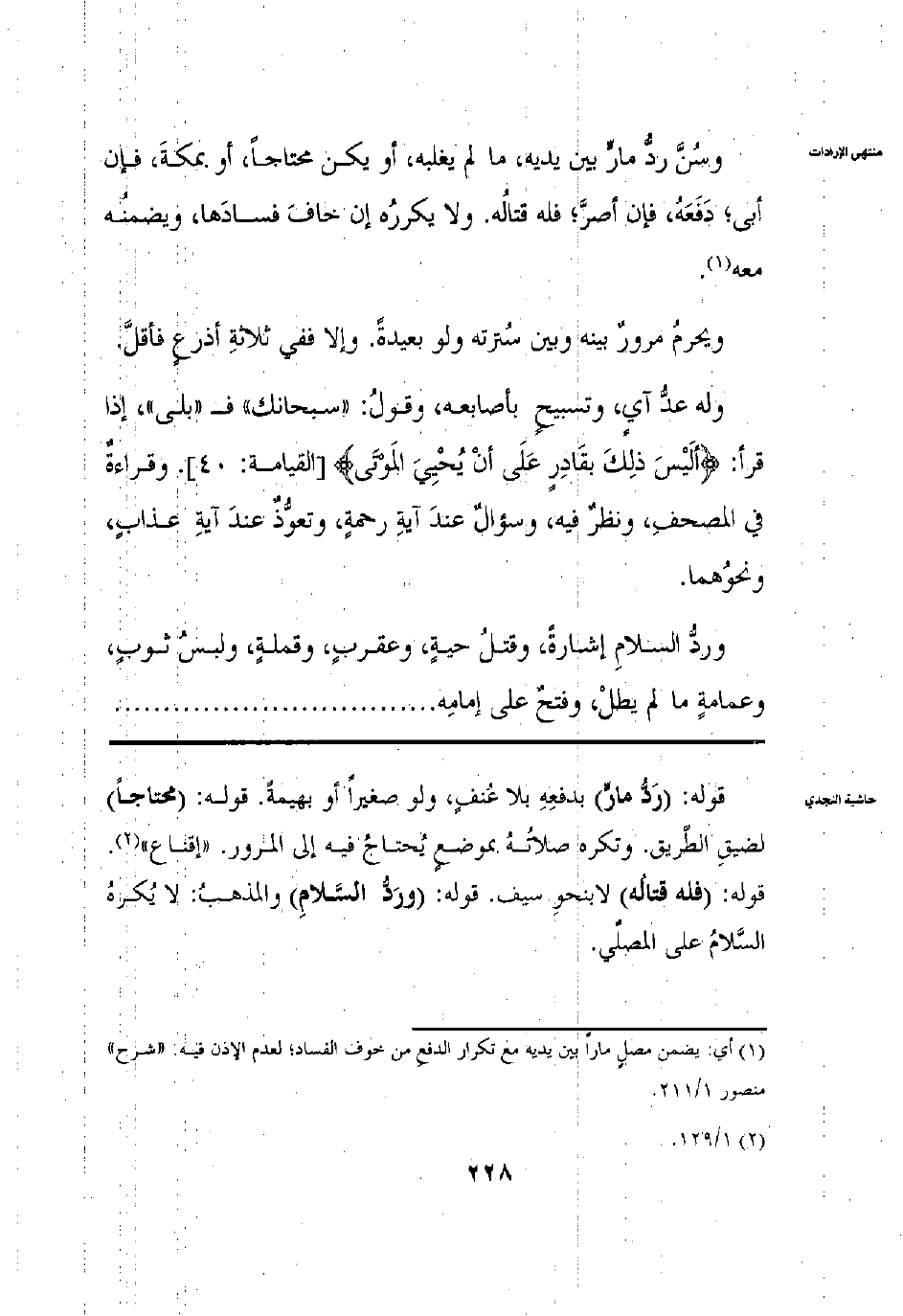 وسُنَّ رَدُّ مَارٍّ بَيْنَ يَدَيْهِ مَا لَمْ يَغْلِبْهُ أَوْ يَكُنْ مُحْتَاجًا أَوْ بِمَكَّةَ فَإِنْ أَبَى فَإِنْ أَصَرَّ فَلَهُ قِتَالُهُ وَلَا يُكَرِّرُهُ إنْ خَافَ فَسَادَهَا وَيَضْمَنُهُ مَعَهُ وَيَحْرُمُ مُرُورٌ بَيْنَهُ وَبَيْنَ سُتْرَتِهِ. وَلَوْ بَعِيدَةً وَإِلَّا فَفِي ثَلَاثَةِ أَذْرُعٍ فَأَقَلَّ وَلَهُ عَدُّ آيِ وَتَسْبِيحٍ بِأَصَابِعِهِ وقَوْلُ: سُبْحَانَكَ، فَبَلَى إذَا قَرَأَ {أَلَيْسَ ذَلِكَ بِقَادِرٍ عَلَى أَنْ يُحْيِيَ الْمَوْتَى} [القيامة: 40] نَصًّا، فَرْضًا كَانَتْ أَوْ نَفْلًا لِلْخَبَرِ. وَأَمَّا {أَلَيْسَ اللَّهُ بِأَحْكَمِ الْحَاكِمِينَ؟} [التين: 8] فَفِي الْخَبَرِ فِيهَا نَظَرٌ، ذَكَرَهُ فِي الْفُرُوعِ ووَ سُؤَالُ عِنْدَ آيَةَ رَحْمَةٍ وَتَعَوُّذٍ بِهِ عِنْدَ آيَةِ عَذَابٍ ونَحْوُهُمَا ورَدُّ السَّلَامِ إشَارَةً وقَتْلُ حَيَّةً وَعَقْرَبٍ وَقَمْلَةٍ ولُبْسُ عِمَامَةٍ وَثَوْبٍ مَا لَمْ يُطِلْ وَفَتْحٌ عَلَى إمَامِهِ