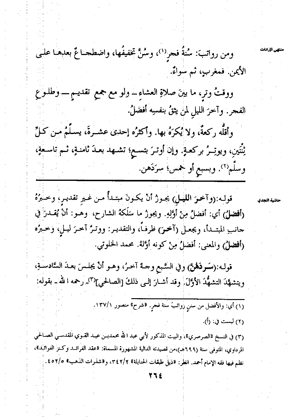 وَمِنْ رَوَاتِبَ سُنَّةُ فَجْرٍ وَسُنَّ تَخْفِيفُهُمَا واضْطِجَاعٌ بَعْدَهَا عَلَى الْجَنْبِ الْأَيْمَنِ فَمَغْرِبٍ ثُمَّ سَوَاءٌ وَوَقْتُ وِتْرٍ: مَا بَيْنَ صَلَاةِ الْعِشَاءِ، وَلَوْ مَعَ جَمْعَ تَقْدِيمٍ وَطُلُوعِ الْفَجْرِ وآخِرَ اللَّيْلِ لِمَنْ يَثِقُ بِنَفْسِهِ أَفْضَلُ وَأَقَلُّهُ رَكْعَةٌ وَلَا يُكْرَهُ بِهَا وَأَكْثَرُهُ إحْدَى عَشْرَةَ يُسَلِّمُ مِنْ كُلِّ ثِنْتَيْنِ وَيُوتِرُ بِرَكْعَةٍ وَإِنْ، أَوْتَرَ بِتِسْعِ تَشَهَّدَ بَعْدَ ثَامِنَةٍ ثُمَّ تَاسِعَةٍ وَسَلَّمَ وَبِسَبْعِ أَوْ بِخَمْسِ سَرَدَهُنَّ