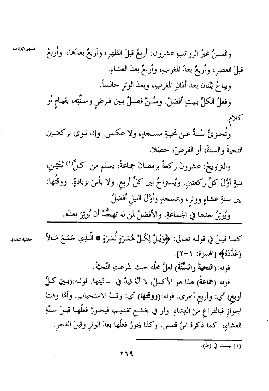 وَالسُّنَنُ غَيْرُ الرَّوَاتِبِ عِشْرُونَ أَرْبَعٌ قَبْلَ الظُّهْرِ: وَأَرْبَعٌ بَعْدَهَا وَأَرْبَعٌ قَبْلَ الْعَصْرِ وَأَرْبَعٌ بَعْدَ الْمَغْرِبِ وَأَرْبَعٌ بَعْدَ الْعِشَاءِ وَيُبَاحُ اثْنَتَانِ بَعْدَ أَذَانِ الْمَغْرِبِ وجَالِسًا وَفِعْلُ الْكُلِّ بِبَيْتٍ أَفْضَلُ وَسُنَّ فَصْلٌ بَيْنَ فَرْضٍ وَسُنَّتِهِ بِقِيَامٍ، أَوْ كَلَامٍ وَتُجْزِئُ سُنَّةُ عَنْ تَحِيَّةِ مَسْجِدٍ وَلَا عَكْسَ وَإِنْ نَوَى بِرَكْعَتَيْنِ التَّحِيَّةَ وَالسُّنَّةَ أَوْ وَالْفَرْضَ، حَصَلَا وَالتَّرَاوِيحُ عِشْرُونَ رَكْعَةً بِرَمَضَانَ جَمَاعَةً يُسَلِّمُ مِنْ كُلِّ اثْنَتَيْنِ، بِنِيَّةِ أَوَّلَ كُلِّ رَكْعَتَيْنِ وَيُسْتَرَاحُ بَيْنَ كُلِّ أَرْبَعِ وَلَا بَأْسَ بِزِيَادَةٍ وَوَقْتُهَا بَيْنَ سُنَّةِ عِشَاءٍ وَوِتْرٍ وبِمَسْجِدٍ وأَوَّلَ اللَّيْلِ أَفْضَلُ ويُوتِرَ بَعْدَهَا فِي جَمَاعَةٍ وَالْأَفْضَلُ لِمَنْ لَهُ تَهَجُّدٌ، أَنْ يُوتِرَ بَعْدَهُ