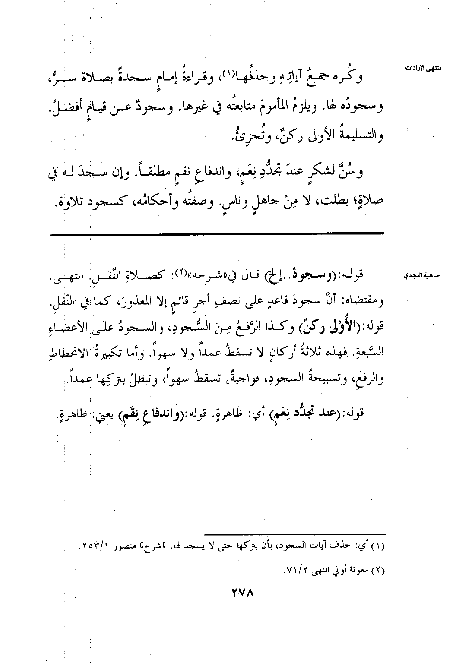وَكُرِهَ جَمْعُ آيَاتِهِ وحَذْفُهَا وقِرَاءَةُ إمَامٍ سَجْدَةٍ بِصَلَاةٍ سِرٍّ وسُجُودُهُ لَهَا وَيَلْزَمُ الْمَأْمُومَ مُتَابَعَتُهُ فِي غَيْرِهَا وَسُجُودُ عَنْ قِيَامٍ أَفْضُلُ وَالتَّسْلِيمَةُ الْأُولَى رُكْنٌ وَتُجْزِئُ وَسُنَّ لِشُكْرِ عِنْدَ تَجَدُّدٍ نِعَمٍ وانْدِفَاعِ نِقَمٍ مُطْلَقًا وَإِنْ سَجَدَ لَهُ فِي صَلَاةٍ بَطَلَتْ لَا مِنْ جَاهِلٍ، أَوْ نَاسٍ وَصِفَتُهُ وَأَحْكَامُهُ كَسُجُودِهِ تِلَاوَةً
