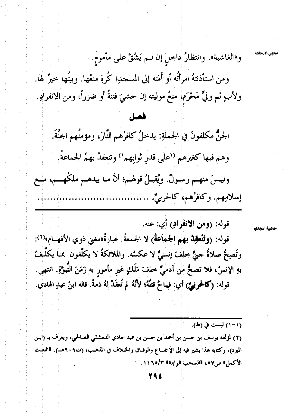 الْجِنُّ مُكَلَّفُونَ فِي الْجُمْلَةِ يَدْخُلُ كَافِرُهُمْ النَّارَ وَمُؤْمِنُهُمْ الْجَنَّةَ وَهُمْ فِيهَا كَغَيْرِهِمْ عَلَى قَدْرِ ثَوَابِهِمْ وَتَنْعَقِدُ ِهِمْ الْجَمَاعَةُ وَلَيْسَ مِنْهُمْ رَسُولٌ وَيُقْبَلُ قَوْلُهُمْ إنَّ مَا بِيَدِهِمْ مِلْكُهُمْ مَعَ إسْلَامِهِمْ وَكَافِرُهُمْ كَالْحَرْبِيِّ