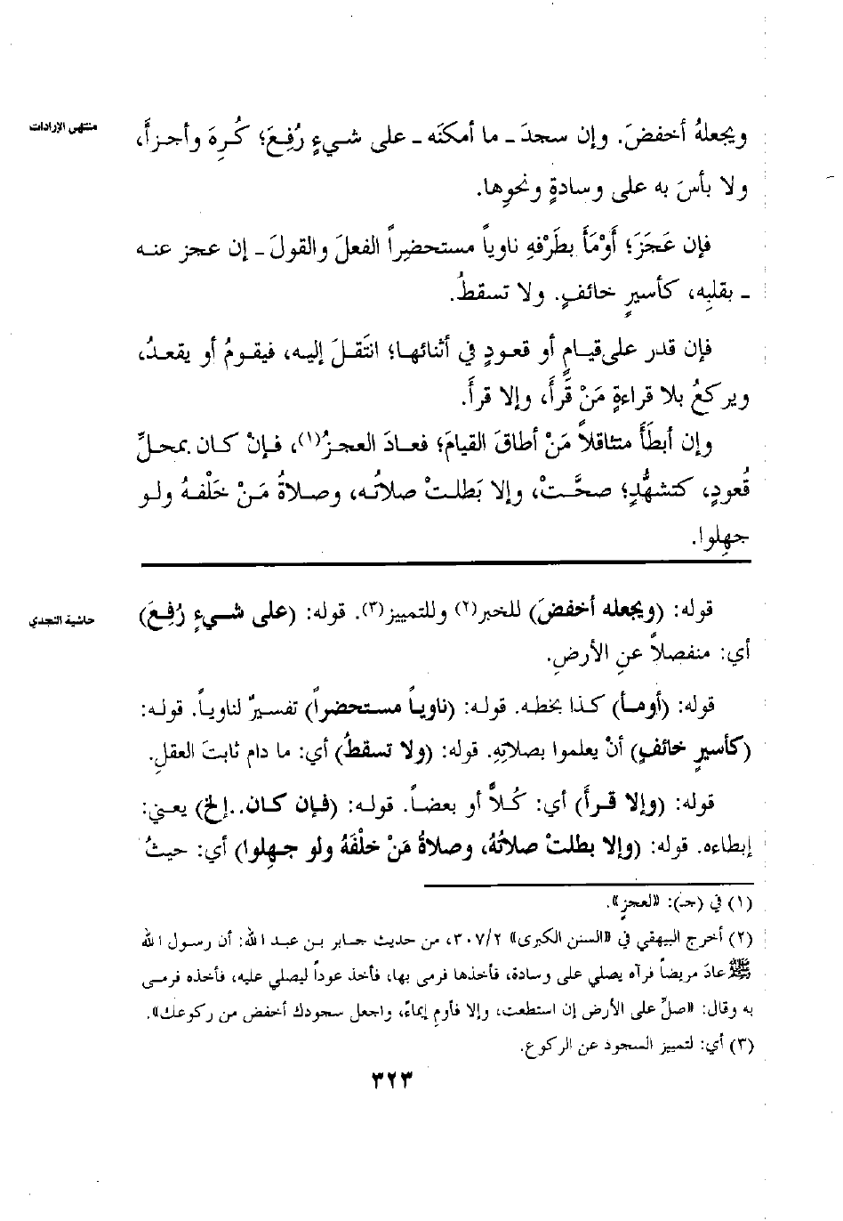 وَيَجْعَلُهُ أَخْفَضَ وَإِذَا سَجَدَ مَا أَمْكَنَهُ عَلَى شَيْءٍ رُفِعَ كُرِهَ وَأَجْزَأَهُ وَلَا بَأْسَ بِهِ عَلَى وِسَادَةٍ وَنَحْوِهَا فَإِنْ عَجَزَ أَوْمَأَ بِطَرْفِهِ نَاوِيًا مُسْتَحْضِرًا الْفِعْلَ والْقَوْلَ إنْ عَجَزَ عَنْهُ بِقَلْبِهِ كَأَسِيرٍ خَائِفٍ وَلَا تَسْقُطُ فَإِنْ قَدَرَ عَلَى قِيَامٍ أَوْ قُعُودٍ فِي أَثْنَائِهَا انْتَقَلَ إلَيْهِ فَيَقُومُ أَوْ يَقْعُدُ وَيَرْكَعُ بِلَا قِرَاءَةٍ مَنْ قَرَأَ وَإِلَّا قَرَأَ وَإِنْ أَبْطَأَ مُتَثَاقِلًا مَنْ أَطَاقَ الْقِيَامَ فَعَادَ الْعَجْزُ فَإِنْ كَانَ بِمَحِلِّ قُعُودٍ كَتَشَهُّدٍ صَحَّتْ وَإِلَّا بَطَلَتْ صَلَاتُهُ وصَلَاةُ مَنْ خَلْفَهُ، وَلَوْ جَهِلُوا