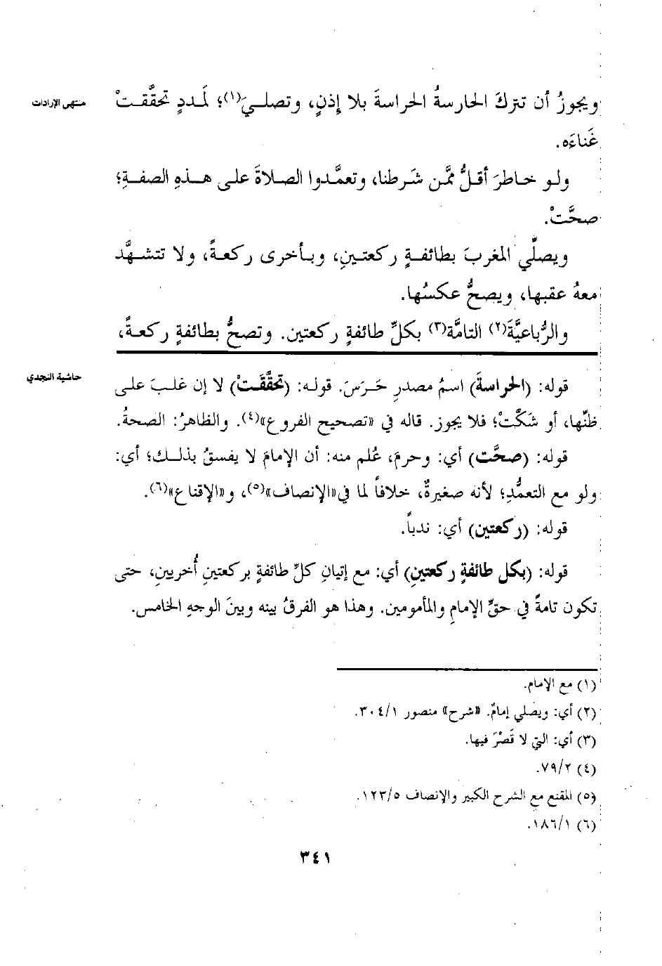 وَيَجُوزُ أَنْ تَتْرُكَ الْحَارِسَةُ الْحِرَاسَةَ بِلَا إذْنِ وتُصَلِّي لِمَدَدٍ تَحَقَّقْتَ غَنَاءَهُ عَنْهَا وَلَوْ خَاطَرَ أَقَلُّ مِمَّنْ شَرَطْنَا وَتَعَمَّدُوا الصَّلَاةَ عَلَى هَذِهِ الصِّفَةِ صَحَّتْ وَيُصَلِّي الْمَغْرِبَ بِطَائِفَةٍ رَكْعَتَيْنِ، والْأُخْرَى رَكْعَةً وَلَا تَتَشَهَّدُ مَعَهُ عَقِبَهَا وَيَصِحُّ عَكْسُهَا والرُّبَاعِيَّةَ التَّامَّةَ بِكُلِّ طَائِفَةٍ رَكْعَتَيْنِ وَتصِحُّ بِطَائِفَةٍ رَكْعَةً