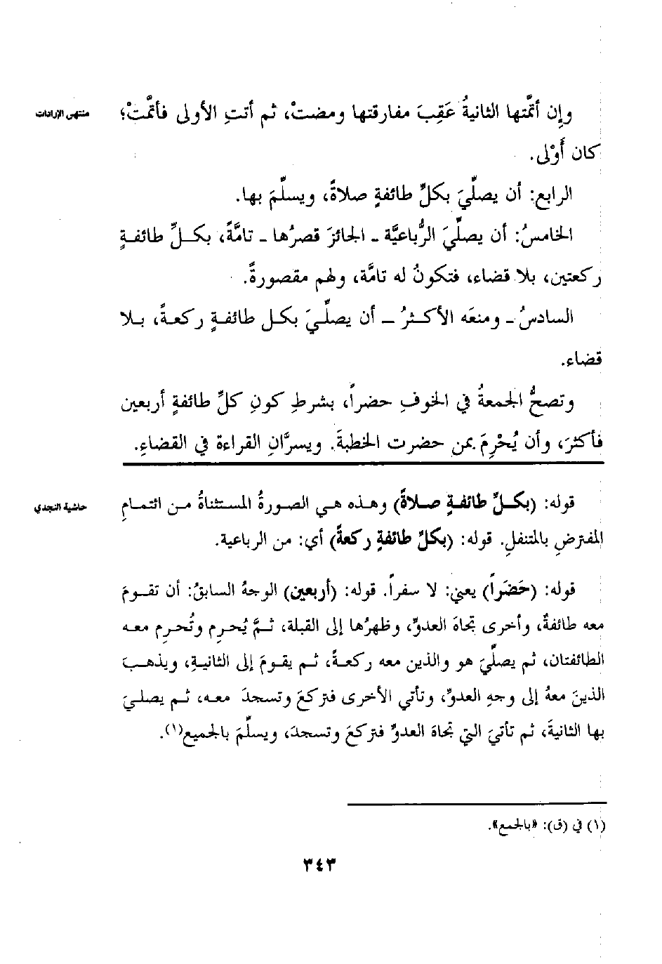 وَإِنْ أَتَمَّتْهَا الثَّانِيَةُ عَقِبَ مُفَارَقَتِهَا وَمَضَتْ ثُمَّ أَتَتْ الْأُولَى فَأَتَمَّتْ كَانَ أَوْلَى الرَّابِعُ: أَنْ «يُصَلِّيَ الْإِمَامُ بِكُلِّ طَائِفَةٍ مِنْ الطَّائِفَتَيْنِ صَلَاةً يُسَلِّمُ بِهَا أَيْ بِكُلِّ طَائِفَةٍ» رَوَاهُ أَحْمَدُ وَأَبُو دَاوُد وَالنَّسَائِيُّ عَنْ أَبِي بَكْرَةَ مَرْفُوعًا، وَالشَّافِعِيُّ عَنْ جَابِرٍ مَرْفُوعًا وَغَايَتُهُ: اقْتِدَاءُ الْمُفْتَرِضِينَ بِالْمُتَنَفِّلِ وَهُوَ مُغْتَفَرٌ هُنَا الْوَجْهُ الْخَامِسُ: أَنْ يُصَلِّيَ الرُّبَاعِيَّةَ الْجَائِزَ قَصْرُهَا تَامَّةً بِكُلِّ طَائِفَةٍ رَكْعَتَيْنِ بِلَا قَضَاءٍ فَتَكُونُ لَهُ تَامَّةً وَلَهُمْ مَقْصُورَةٌ السَّادِسُ: وَمَنَعَهُ الْأَكْثَرُ أَنْ يُصَلِّيَ بِكُلِّ طَائِفَةٍ رَكْعَةً بِلَا قَضَاءٍ وَتَصِحُّ الْجُمُعَةُ فِي الْخَوْفِ حَضَرًا بِشَرْطِ كَوْنِ كُلِّ طَائِفَةٍ أَرْبَعِينَ فَأَكْثَرَ وأَنْ يُحْرِمَ بِمَنْ حَضَرَتْ الْخُطْبَةَ وَيُسِرَّانِ الْقِرَاءَةَ فِي الْقَضَاءِ