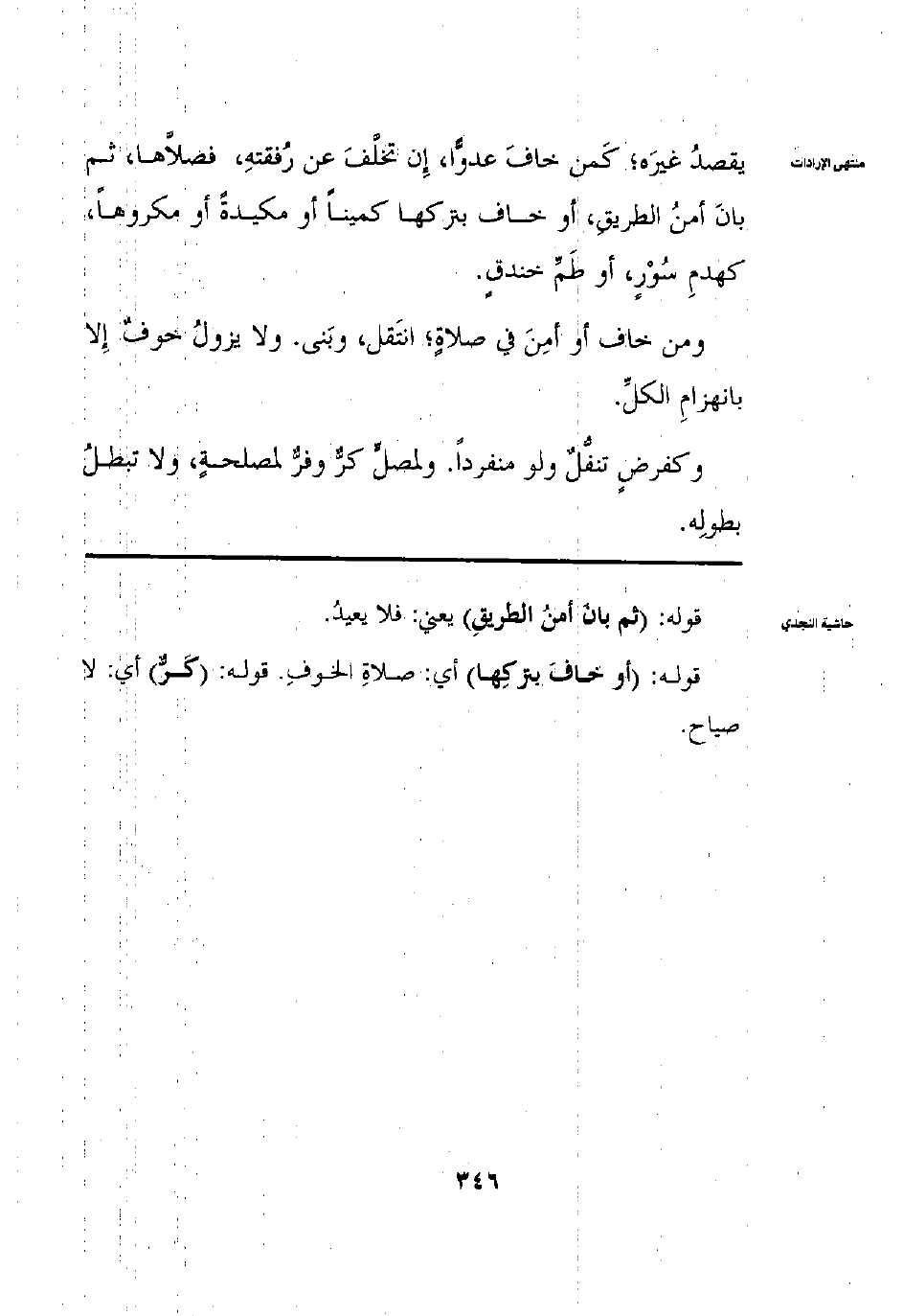 يَقْصِدَ غَيْرَهُ كمَنْ خَافَ عَدُوًّا إنْ تَخَلَّفَ عَنْ رُفْقَتِهِ فَصَلَّاهَا ثُمَّ بَانَ أَمْنُ الطَّرِيقِ أَوْ خَافَ بِتَرْكِهَا كَمِينًا أَوْ مَكِيدَةً أَوْ مَكْرُوهًا، كَهَدْمِ سُورٍ، أَوْ طَمِّ خَنْدَقٍ وَمَنْ خَافَ أَوْ أَمِنَ فِي صَلَاةٍ انْتَقَلَ وَبَنَى وَلَا يَزُولُ خَوْفٌ إلَّا بِانْهِزَامِ الْكُلِّ وَكَفَرْضِ تَنَفُّلٍ وَلَوْ مُنْفَرِدًا وَالْمُصَلِّي كَرٍّ وَفَرٍّ لِمَصْلَحَةٍ وَلَا تَبْطُلُ بِطُولِهِ