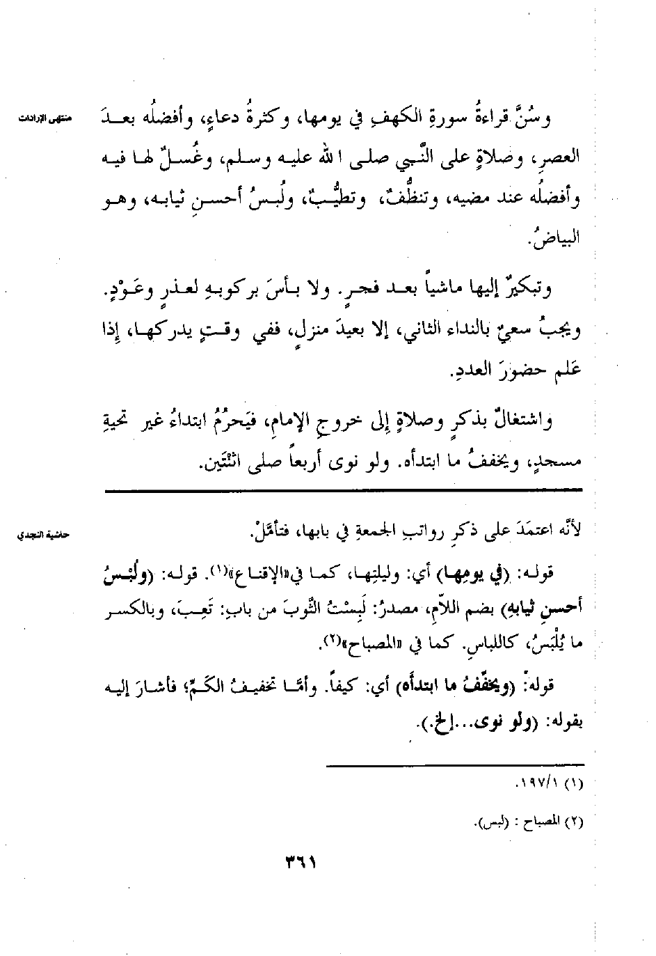 وَسن قِرَاءَةُ سُورَةِ الْكَهْفِ فِي يَوْمِهَا وكَثْرَةُ دُعَاءٍ وَأَفْضَلُهُ بَعْدَ الْعَصْرِ وصَلَاةٍ عَلَى النَّبِيِّ صَلَّى اللَّهُ عَلَيْهِ وَسَلَّمَ وغُسْلٌ لَهَا فِيهِ وَأَفْضَلُهُ عِنْدَ مُضِيِّهِ وتَنَظُّفٌ وَتَطَيُّبٍ ولُبْسُ أَحْسَنِ ثِيَابِهِ وَهُوَ الْبَيَاضُ وتَبْكِيرٌ إلَيْهَا مَاشِيًا بَعْدَ فَجْرٍ وَلَا بَأْسَ بِرُكُوبِهِ لِعُذْرٍ وعَوْدٍ وَيَجِبُ سَعْيٌ بِالنِّدَاءِ الثَّانِي إلَّا بَعِيدَ مَنْزِلٍ عَنْ ففِي وَقْتٍ يُدْرِكُهَا إذَا عَلِمَ حُضُورَ الْعَدَدِ واشْتِغَالٌ بِذِكْرٍ وَصَلَاةٍ إلَى خُرُوجِ الْإِمَامِ فيَحْرُمُ ابْتِدَاءُ صَلَاةٍ غَيْرِ تَحِيَّةِ مَسْجِدٍ وَيُخَفِّفُ مَا ابْتَدَأَهُ وَلَوْ نَوَى أَرْبَعًا صَلَّى اثْنَتَيْنِ