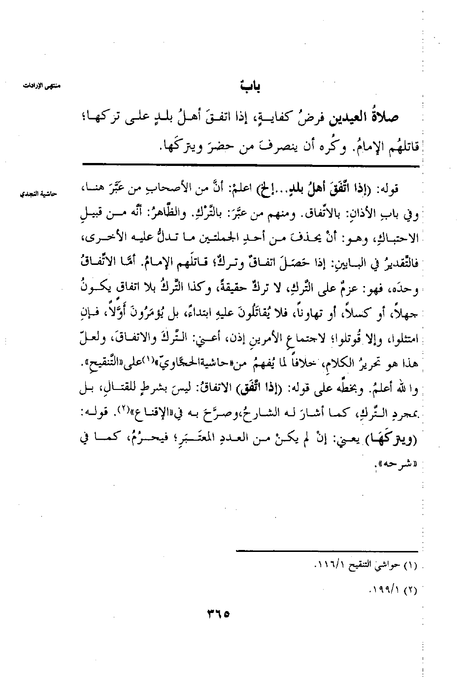 صَلَاةُ الْعِيدَيْنِ، فَرْضُ كِفَايَةٍ إذَا اتَّفَقَ أَهْلُ الْبَلَدِ عَلَى تَرْكِهَا قَاتَلَهُمْ الْإِمَامُ وَكُرِهَ إنْ يَنْصَرِفَ مَنْ حَضَرَ وَيَتْرُكَهَا